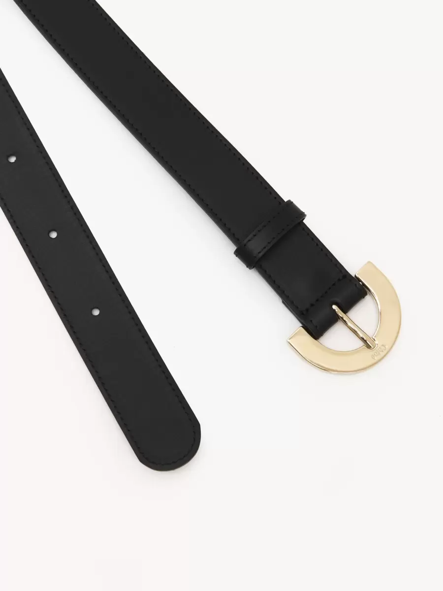 This “C” black leather belt features a gold brass buckle shaped as the Maison’s signature “C” in synergy with the shoe line. The sleek, slim belt is worn on the waist or hips, making it the perfect accessory to style your dress, coat or jeans.