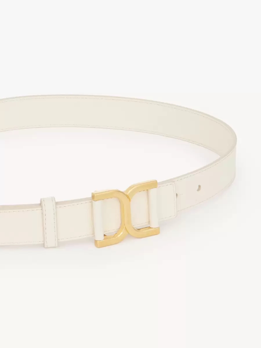 Marcie belt in grained calfskin with the line’s iconic signature in the brushed gold metallic buckle. Fastened by a collar stud, the belt has clean lines for an everyday piece elevating jeans and trousers. Multiple holes allow you to adjust the fit.