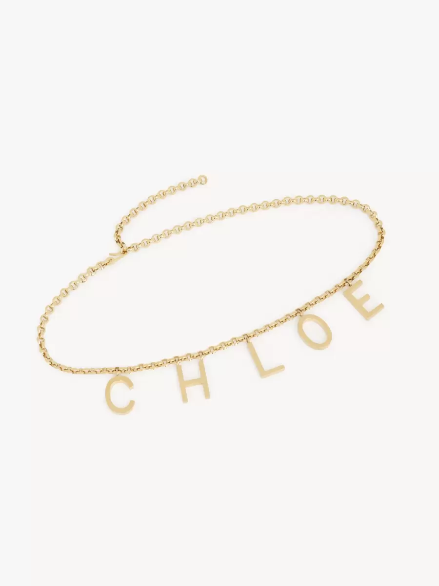 Chloé Letters jewelry belt in vintage gold brass, expressing the Chloé signature through letter charms. The adjustable chain has a hook closure.