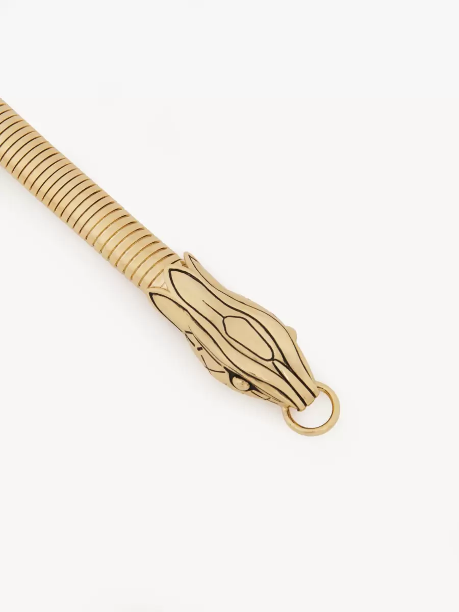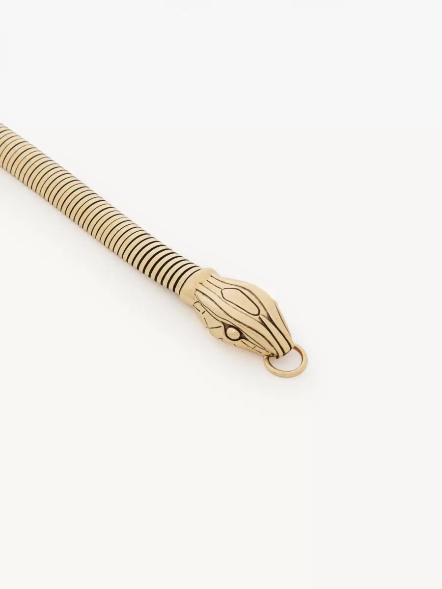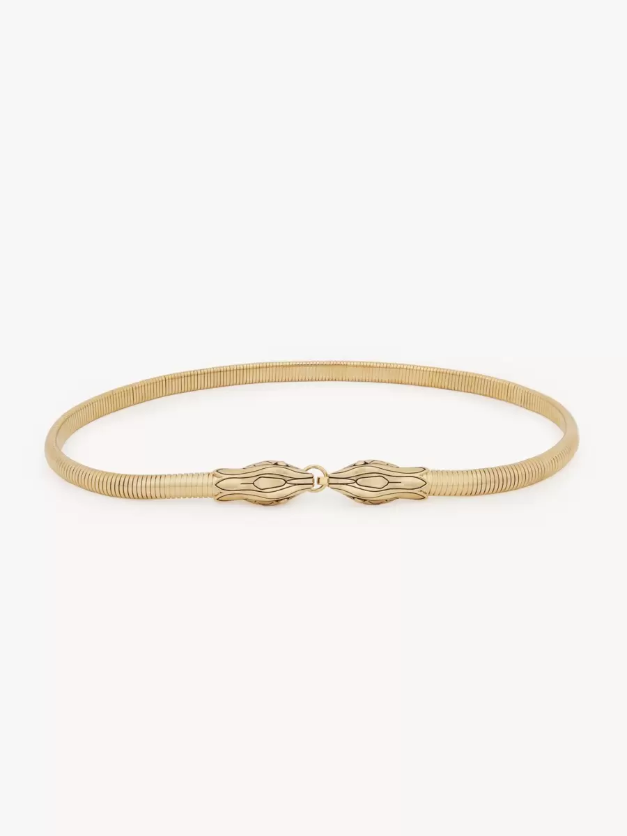Chloé Snake jewelry belt inspired by embroidery on an archival Chloé dress. The elastic strap is encased in a chain combining gold and black tones, featuring two refined snake heads that connect in the front closure. Wear the belt on the waist or hips to suit your silhouette.