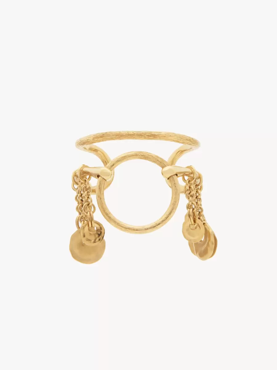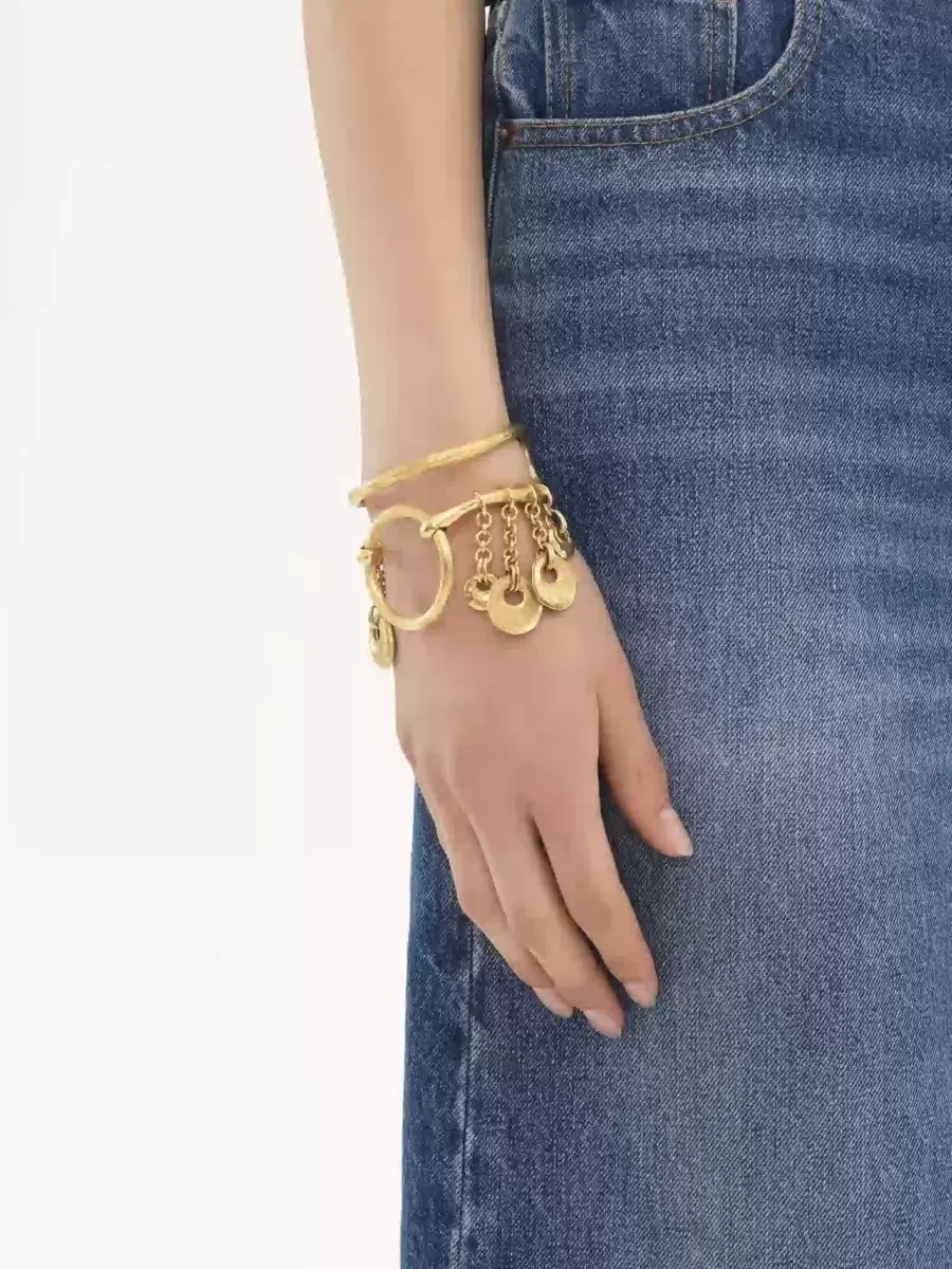 Chloé Eclectic bracelet in vintage gold brass. Revealing smooth, hammered and brushed textures with polished and matte finishes, the bracelet features graphic, curved lines and multiple petal pendants set on dangling chains. A Chloé logo engraving signs this piece.