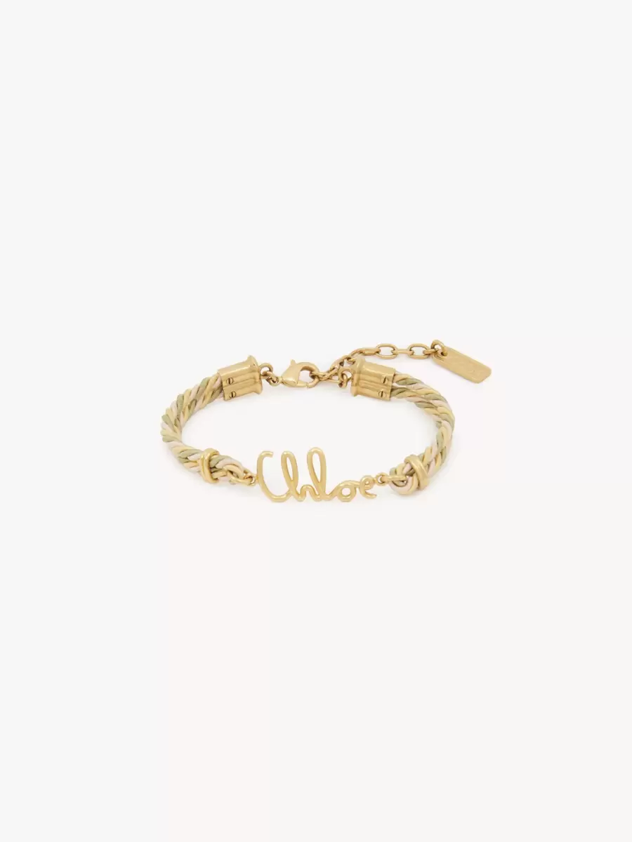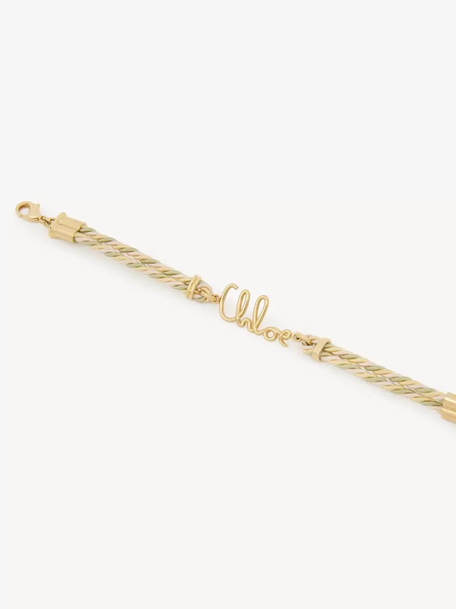 Chloé Plage bracelet in gold brass with a double cotton-viscose braid in pastel tones. Inspired by the Maison’s heritage, the Chloé Iconic signature adorns the center. A gold-tone Chloé logo plate finishes this adjustable bracelet.