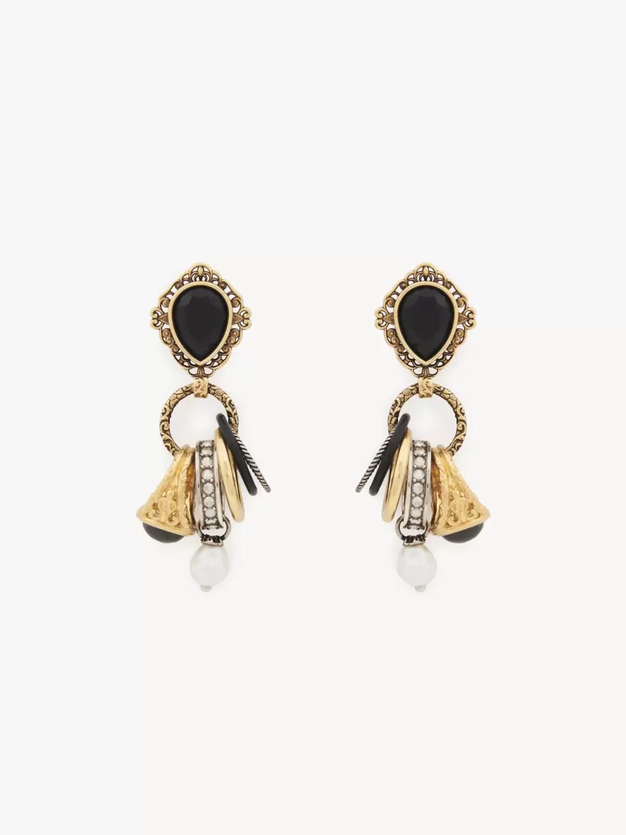 Chloé Antique Pearls dangling earrings in meticulously cut vintage gold brass, resin, Portoro marble and crystal glass. The ornamental design showcases a black faceted teardrop and a cluster of five rings with different textures and embellishments. The combination of gold and palladium tones nods to the Chloé DNA.