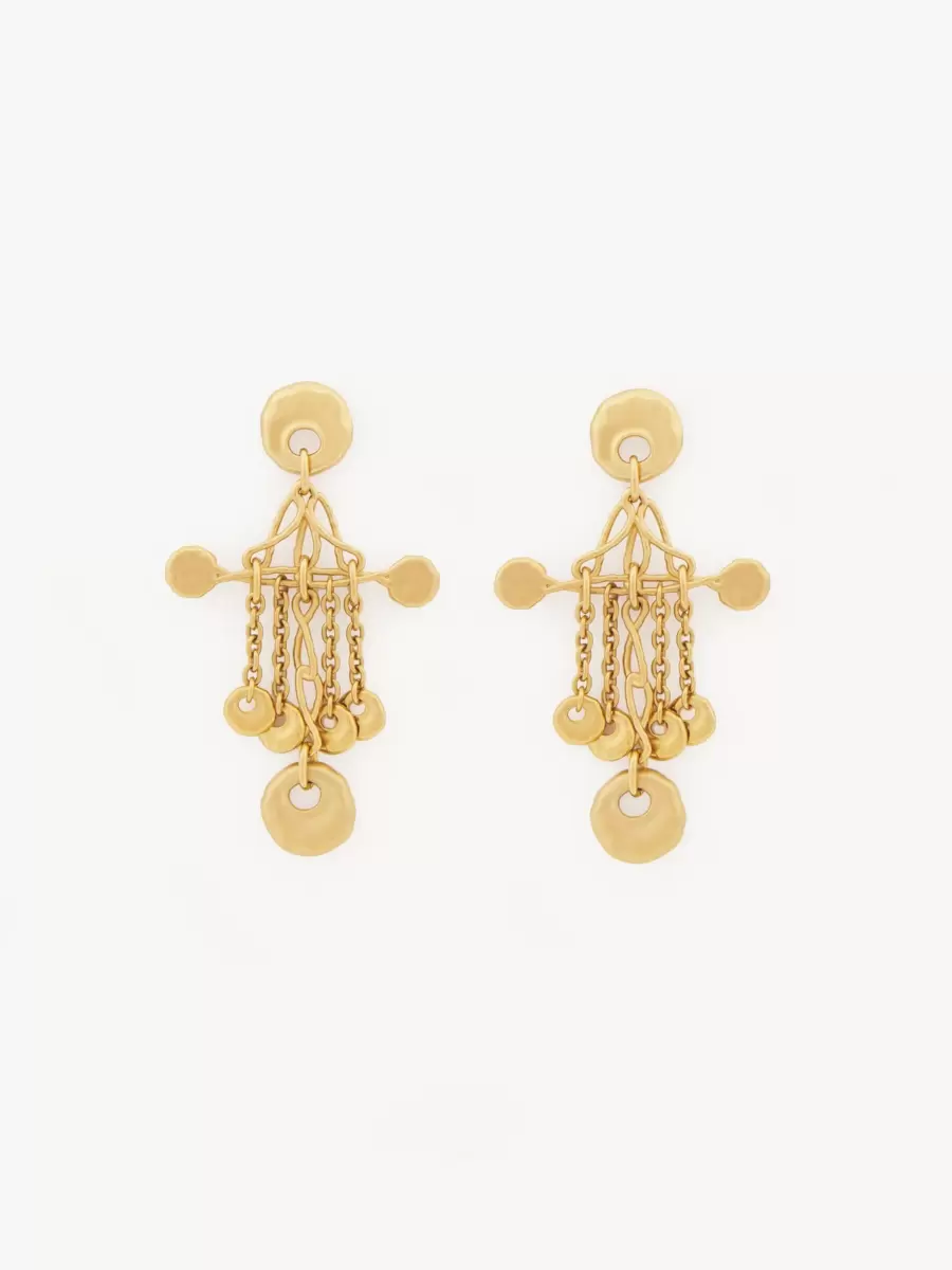 Chloé Eclectic earrings in vintage gold brass. Smooth and hammered textures come together in a bold silhouette incorporating chains, links and petal-inspired pendants. A Chloé logo engraving finishes these earrings.