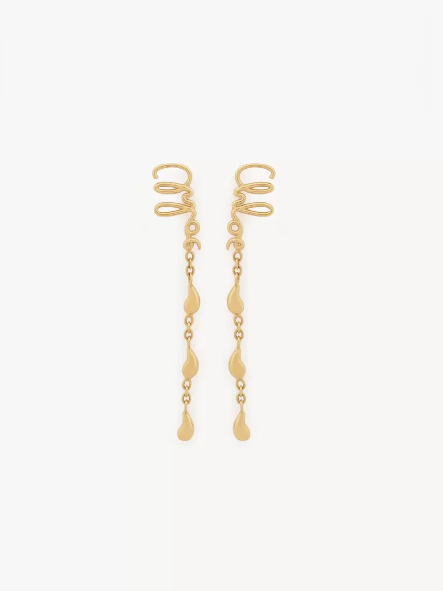 Chloé Iconic dangling earrings in vintage gold brass. Inspired by a heritage chain belt, the Chloé Iconic signature is combined with a dangling chain featuring three accent embellishments nodding to the “é” in Chloé. A Chloé logo engraving signs these earrings, which can be worn in combination with other pieces from the Maison’s jewelry collection.