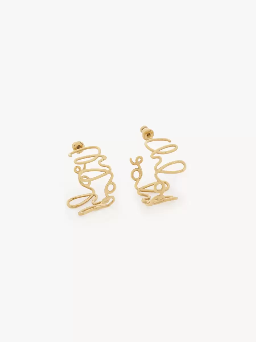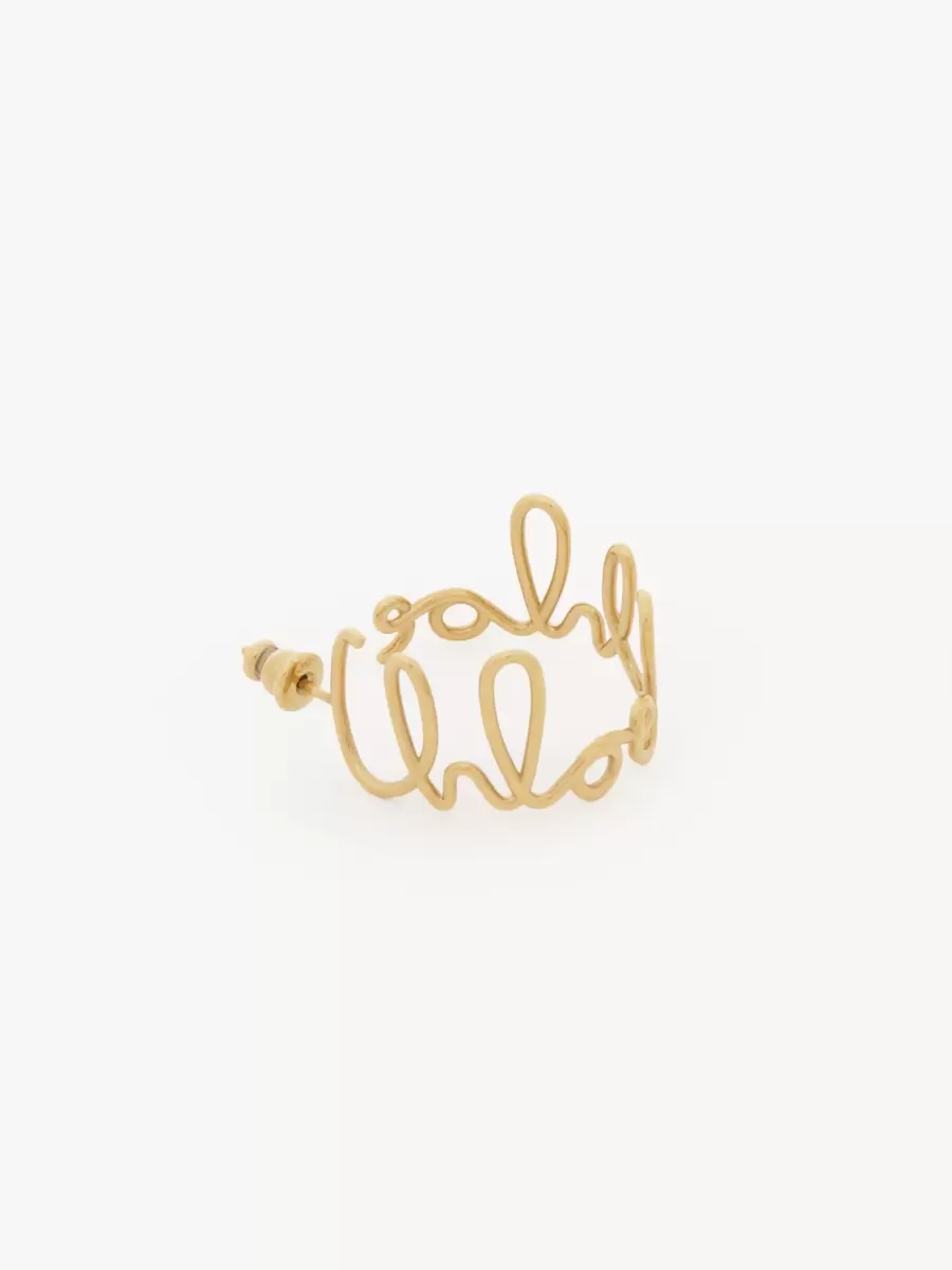 Chloé Iconic hoop earrings in vintage gold brass, featuring the Chloé signature inspired by a chain belt rooted in the Maison’s heritage. A Chloé logo engraving finishes the hoop silhouette. These earrings can be worn in combination with other pieces from the Maison’s jewelry collection.