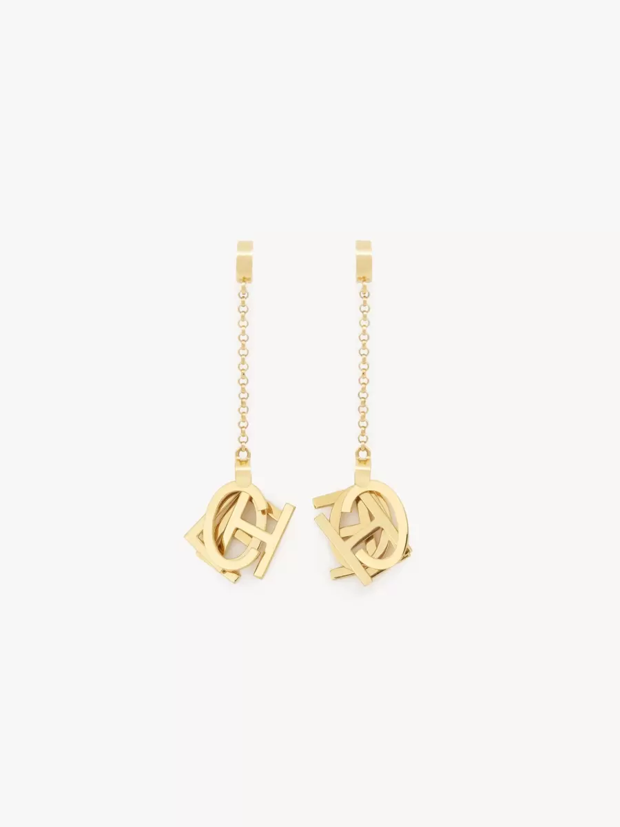 Chloé Letters dangling earrings in vintage gold brass. Set on a chain, a cluster of overlaid letters spelling out Chloé expresses the Maison’s signature.