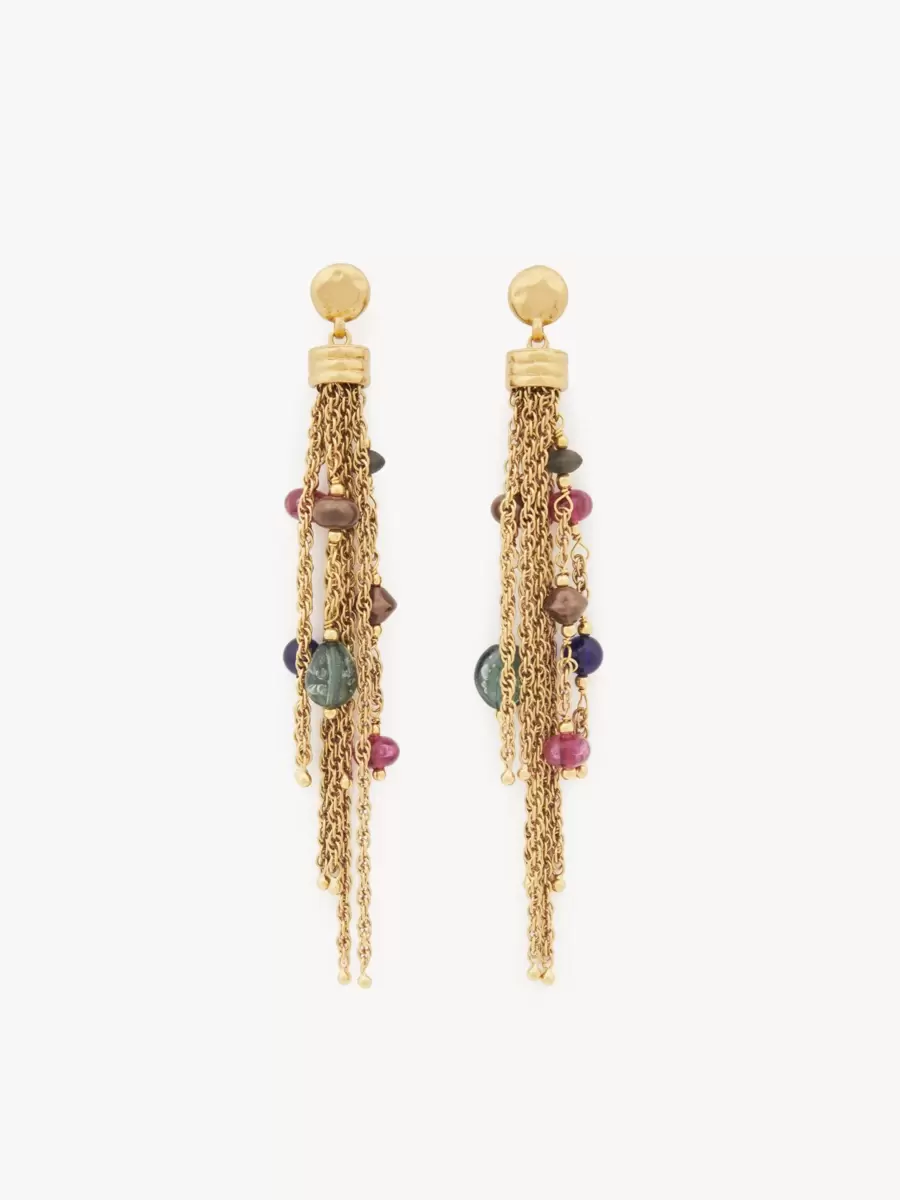 Chloé Pompoms earrings in vintage gold brass, synthetic pearls and crystal glass. Showcasing an interplay of textures and materials, meticulously hand-assembled chain tassels are embellished with multicolor synthetic pearls and crystal glass in an asymmetrical design. A Chloé logo engraving finishes these earrings.