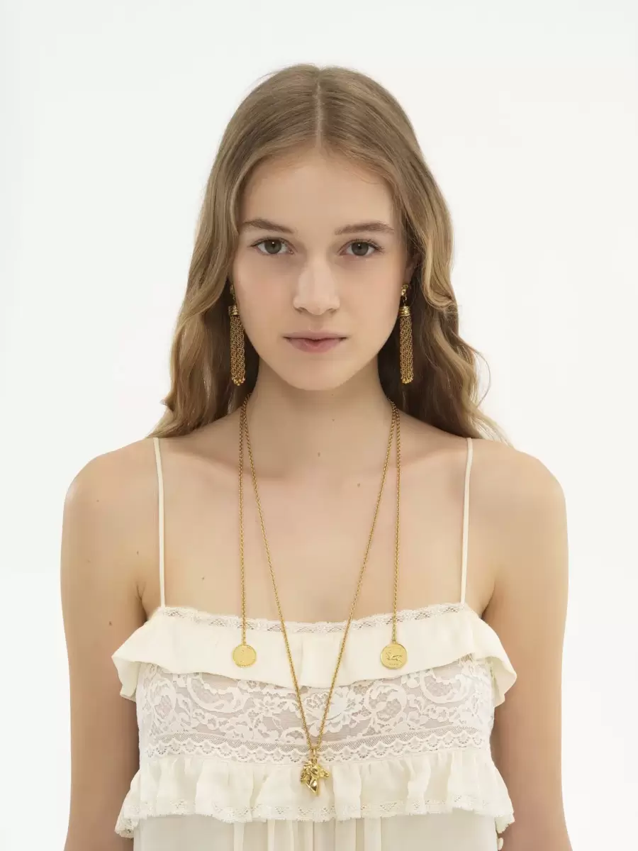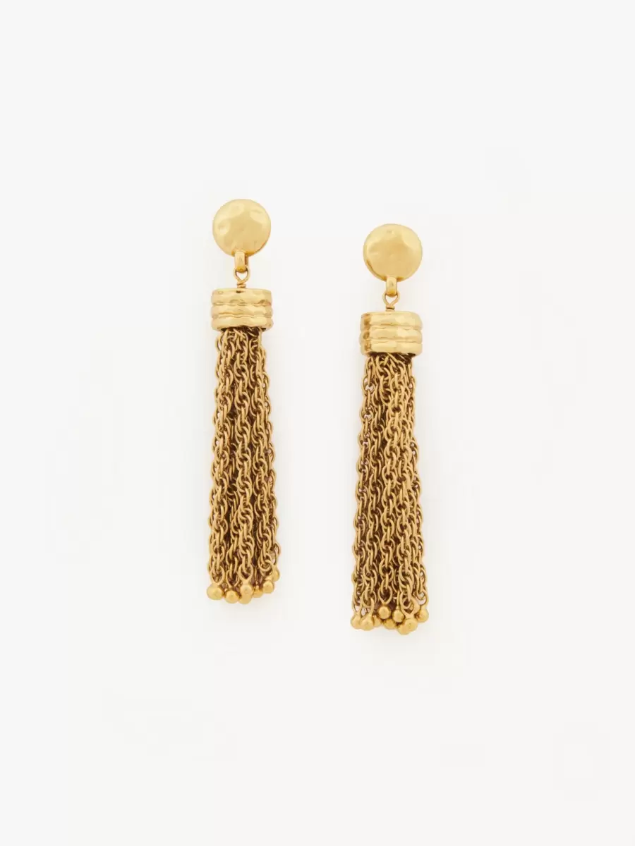 Chloé Pompoms earrings in vintage gold brass, featuring a meticulously hand-assembled chain tassel set on a hammered round petal. A Chloé logo engraving finishes this piece.