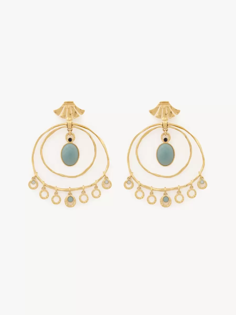 Chloé Sunflower round earrings in gold brass with smooth and hammered textures for a hand-made feel. Double hoops are detailed with multiple round pendants, small sodalite and amazonite studs, and large amazonite stones at the center.