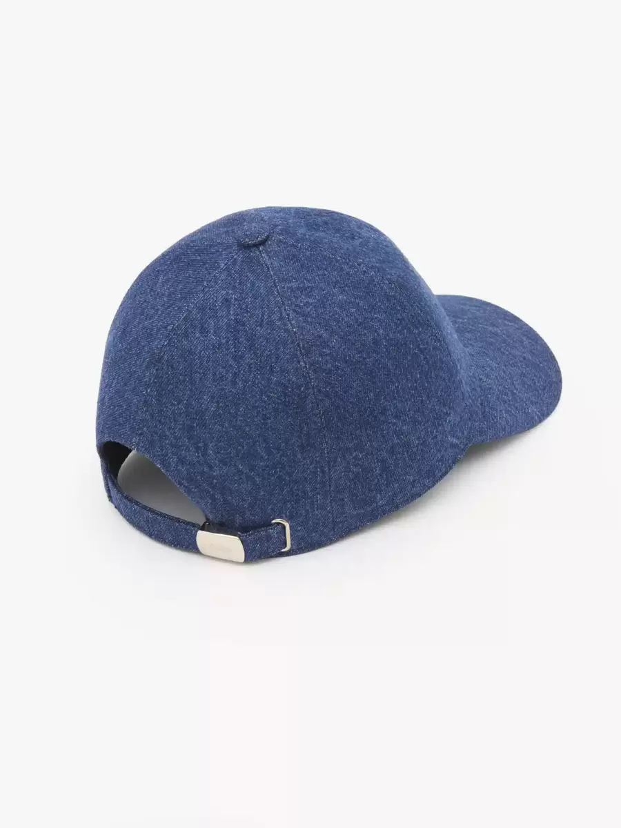 Swing cap in organic cotton denim, detailed with a gold-toned Chloé signature rooted in the Maison’s heritage. The back strap with a Chloé-engraved brass closure adjusts the fit.