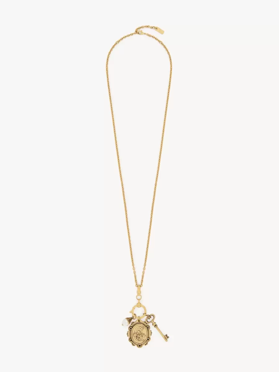 Château Treasures pendant necklace in vintage gold brass, featuring three charms set on a central ring: an ornamental “C” medal inlaid with black glass studs, a key, and a pearl. The Chloé logo is engraved on various charms, while a gold-tone Chloé logo plate signs the chain.