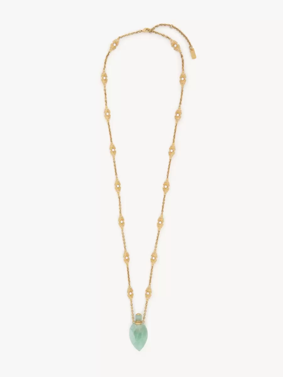 Chloé Elixir pendant necklace in vintage gold brass, featuring an amphora-shaped vial in hand-cut fluorite. The chain is embellished with ornamental pieces and tiny inlaid resin pearls. A Chloé logo engraving signs the vial cap, while a gold-tone Chloé logo plate finishes this piece.