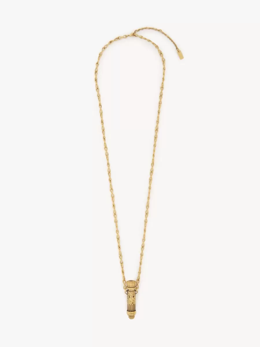 Chloé Elixir pendant necklace in vintage gold brass, featuring an ornamental tube vial set on an infinity chain. A Chloé logo engraving signs the pendant, while a gold-tone Chloé logo plate finishes the chain.