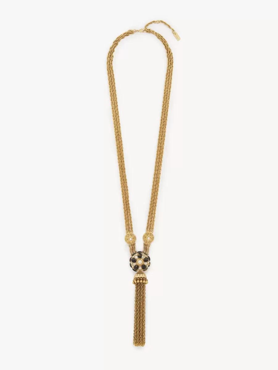Chloé Magnificent pendant necklace in gold brass. Multiple chains feature two small ornamental pendants inlaid with resin pearls, and a large flower-inspired pendant inlaid with Portoro marble, resin pearls and crystal glass. A chain tassel finishes this adjustable necklace, signed with a gold-tone Chloé logo plate.