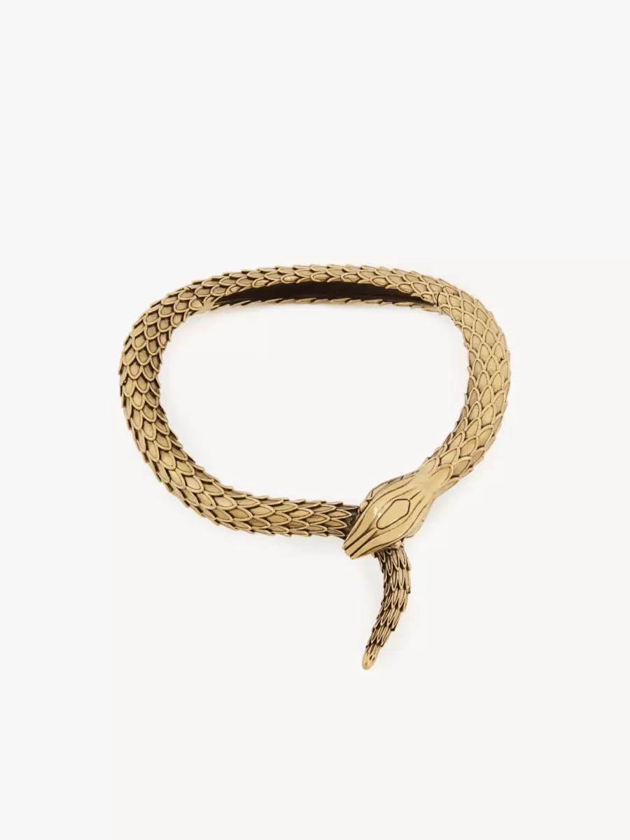 Chloé Snake necklace prominently featured on the runway, inspired by embroidery on an archival Chloé dress. Large scales creating sophisticated texture, a wrap-around shape and a refined snake head make this necklace a sculptural, statement piece. A mix of gold and black tones creates texture.