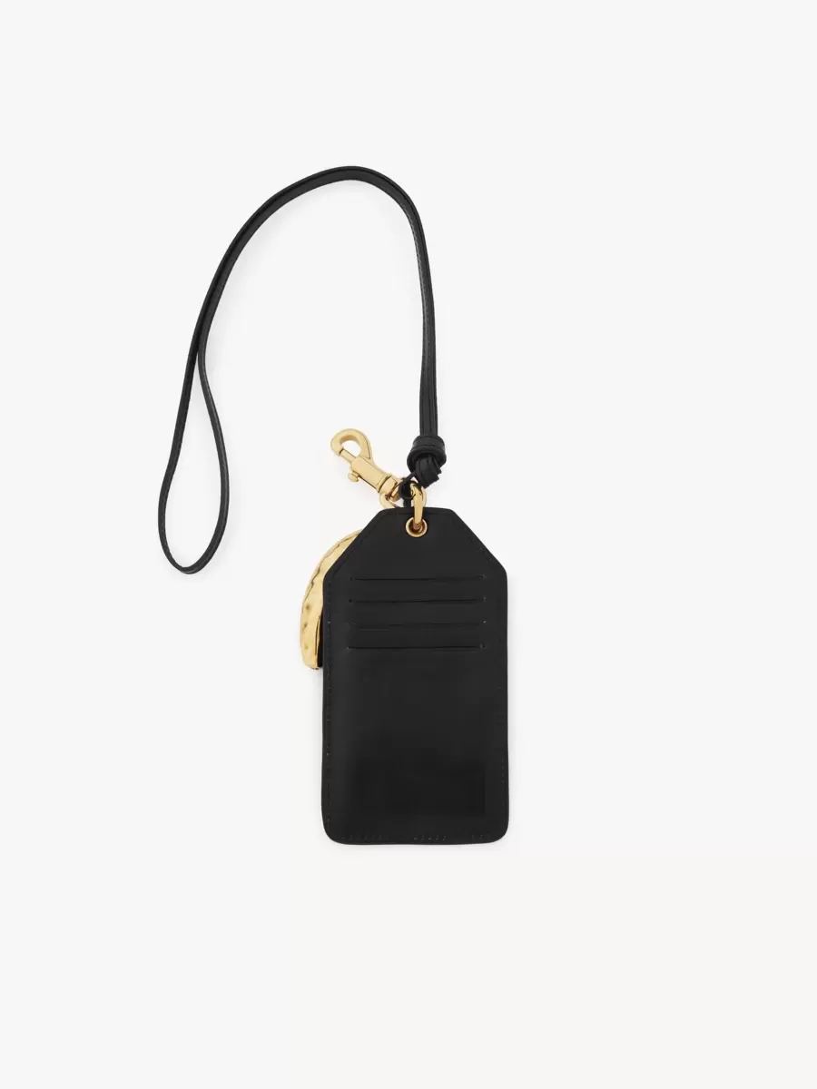 Crafted from natural shiny buffalo leather, this Banana tag is embellished with a playful vintage brass charm in a nod to the Maison’s Spring 2001 collection. The tag comes with four card slots, a hook and a tie fastening.