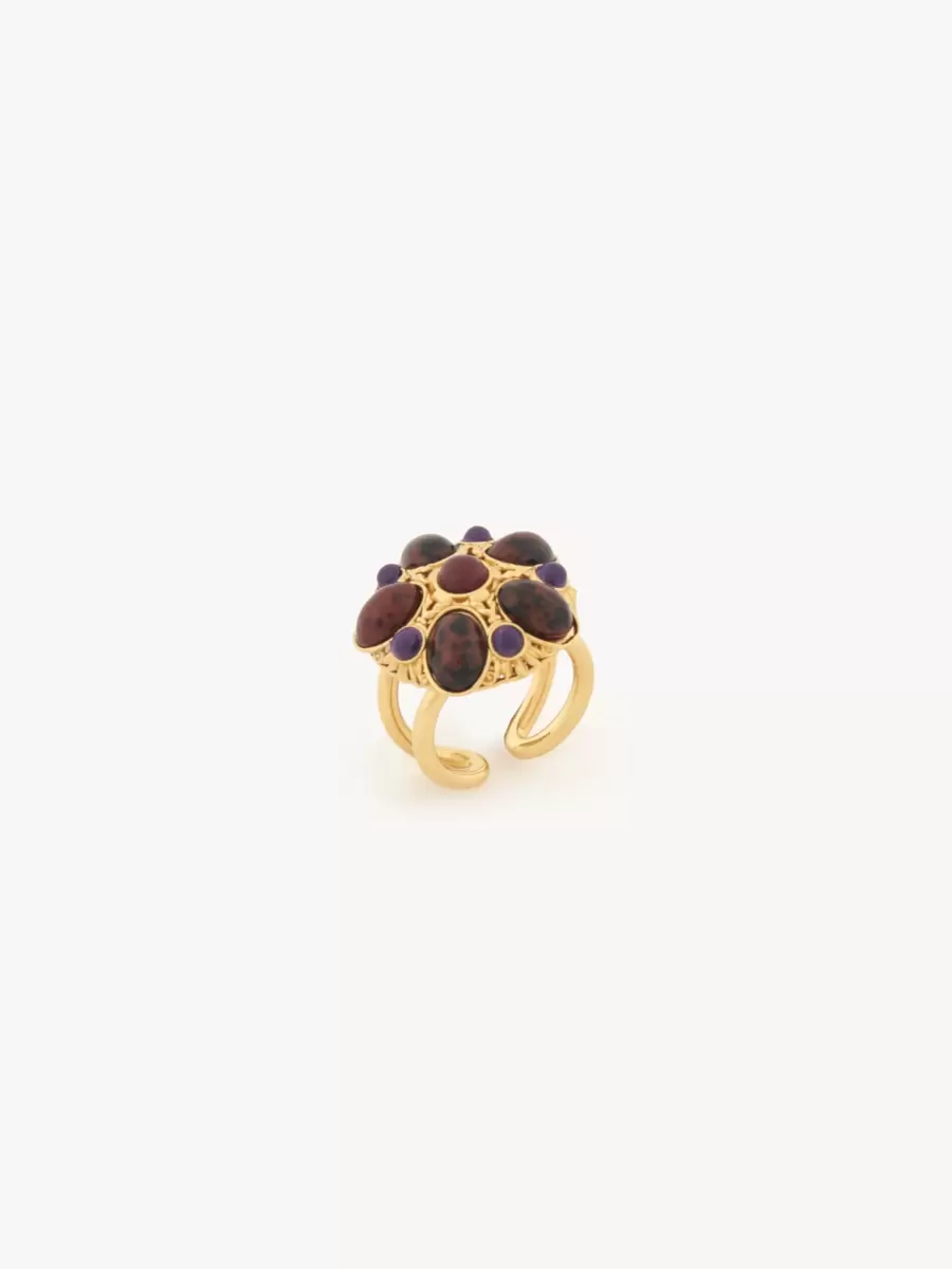 Chloé Eternity ring in gold brass, depicting a large, ornamental flower embellished with colored resin and brown obsidian studs. The double band is open at the back. A Chloé logo engraving signs this piece.