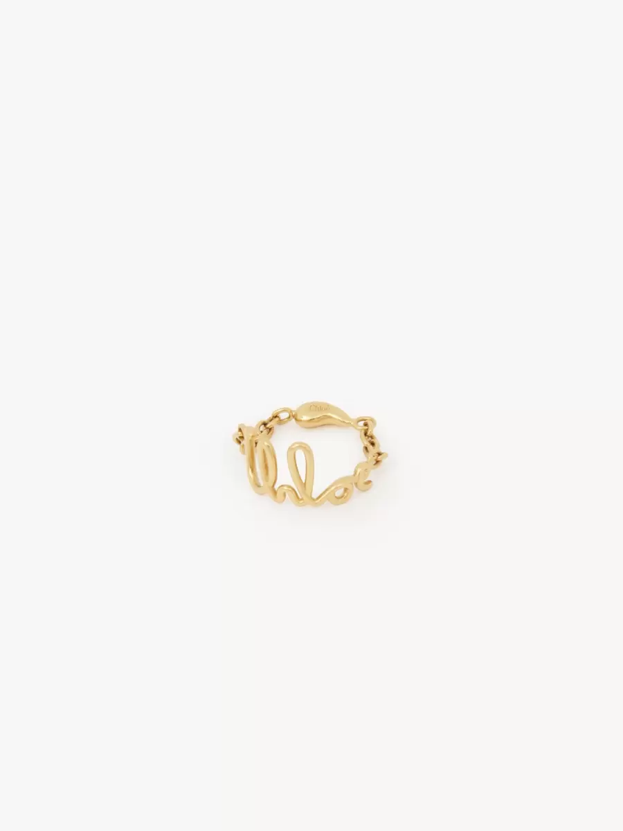 Chloé Iconic ring in vintage gold brass, inspired by a heritage chain belt. A chain ring showcasing the Chloé Iconic signature is combined with a second ring featuring a series of accents nodding to the “é” in Chloé.