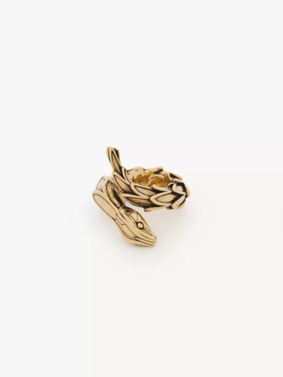 Chloé Snake ring featured on the runway, inspired by embroidery on an archival Chloé dress. Large scales creating sophisticated texture, a wrap-around shape, and a refined snake head make this ring a sculptural piece. A mix of gold and black tones creates texture.