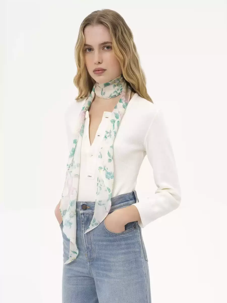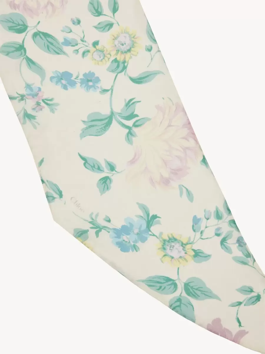 Printed bandeau scarf in organic silk charmeuse with a floral motif depicting peonies and leaves, inspired by the Maison’s heritage. The sheer, inkjet-printed scarf is signed with a subtle Chloé logo at the tip.