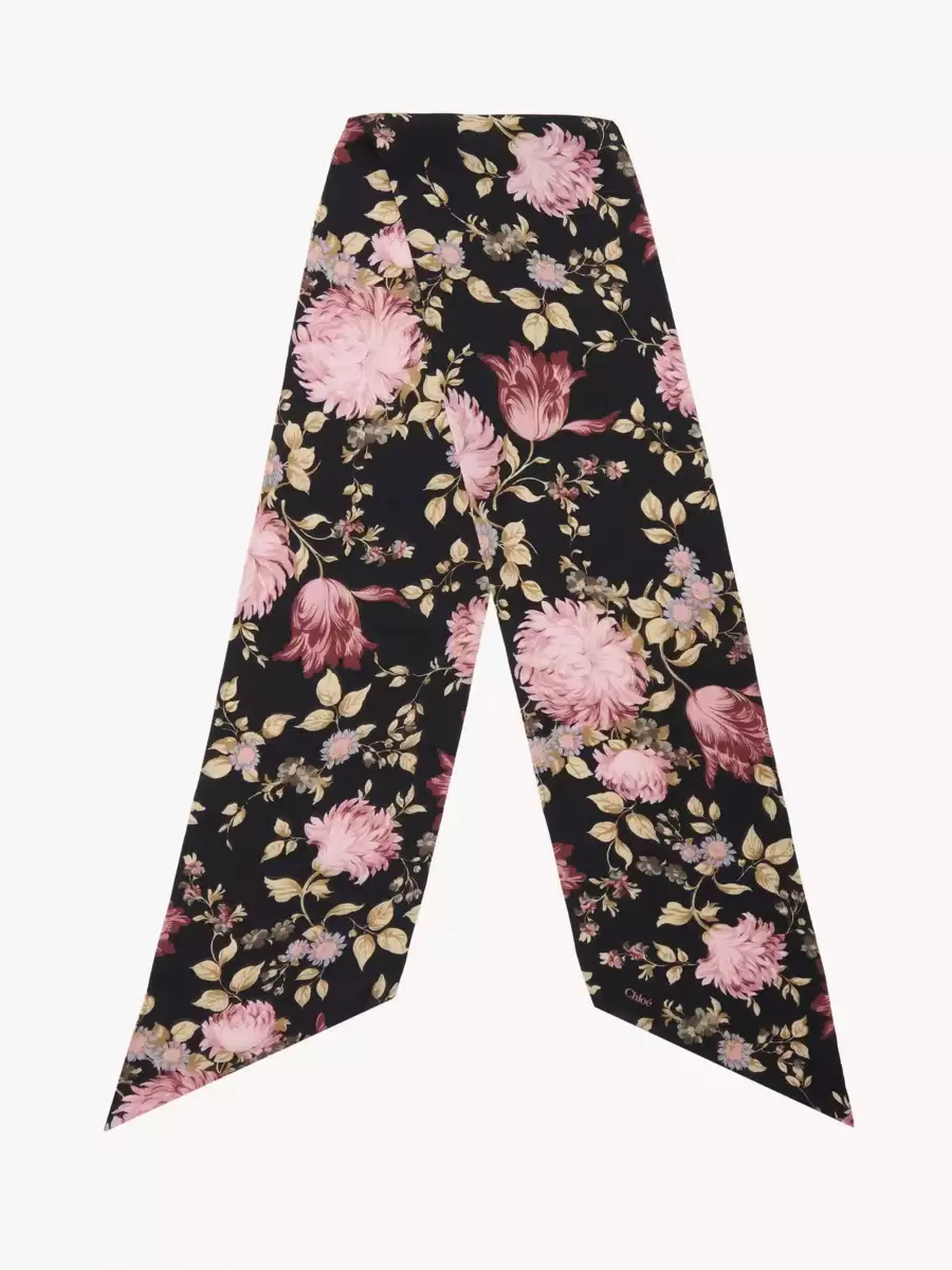 Printed wide bandeau scarf in organic silk charmeuse with a floral motif depicting peonies and leaves, inspired by the Maison’s heritage. This sheer, inkjet-printed scarf is signed with a subtle Chloé logo at the tip.