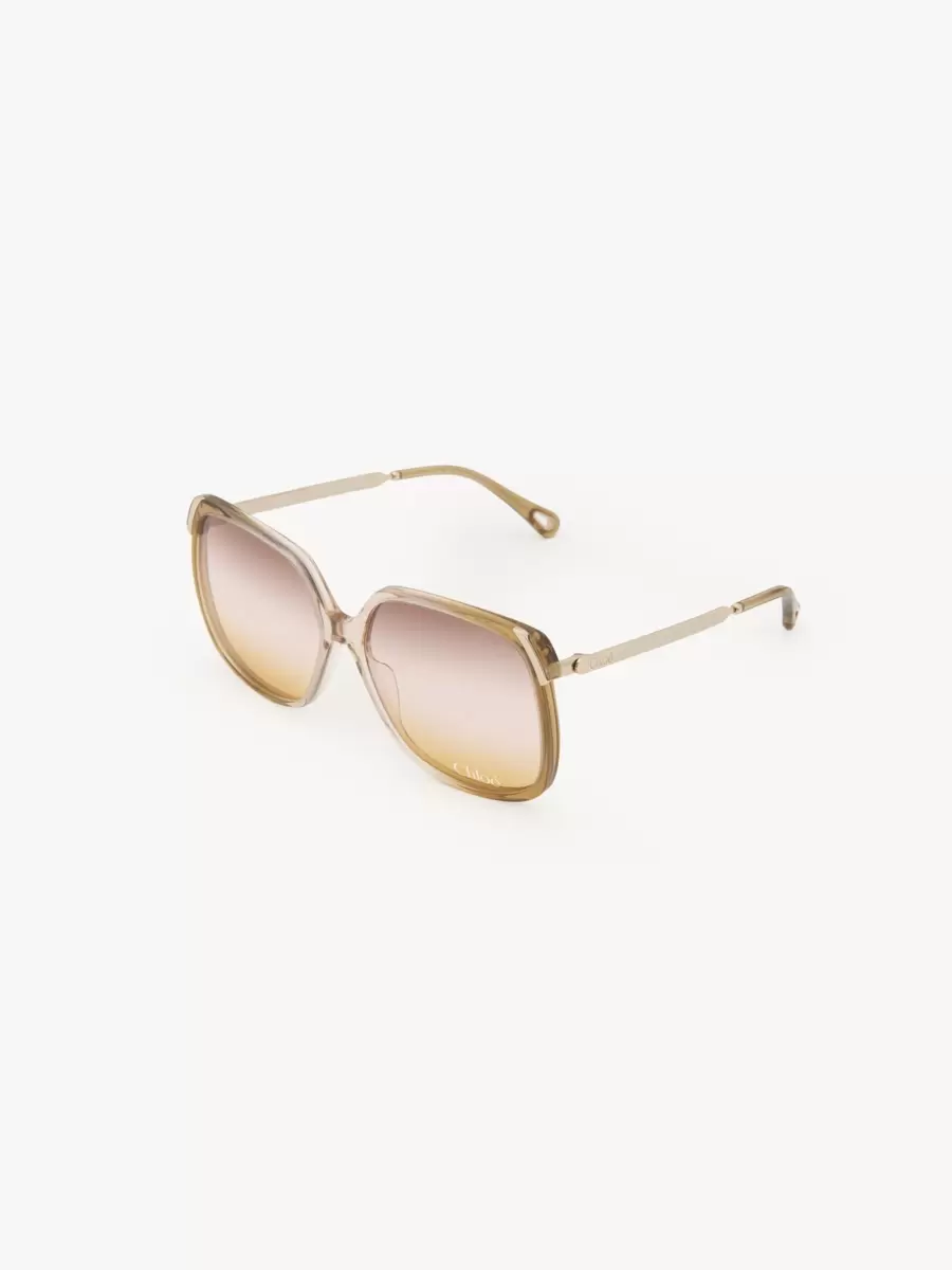 These Aly square sunglasses have a 70s-style frame in a mix of transparent light pink lower-impact acetate and shiny gold metal. The triple gradient lenses in brown, light pink and yellow are signed with the Chloé logo.