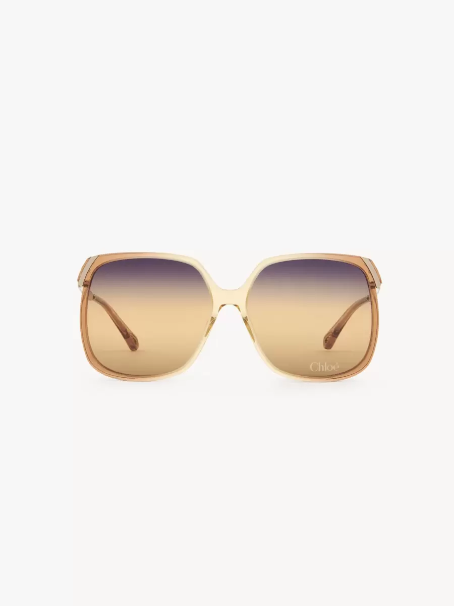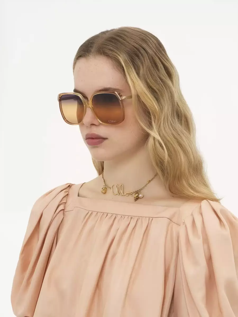 These Aly square sunglasses have a 70s-style frame in a mix of transparent ocher lower-impact acetate and shiny gold metal. The triple gradient lenses in violet, honey and brown are signed with the Chloé logo.