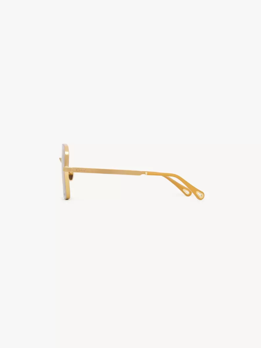 These Aly square sunglasses pair a thick graphic frame in shiny gold-tone metal with triple gradient ocher lenses. The Chloé logo finishes the left lens.