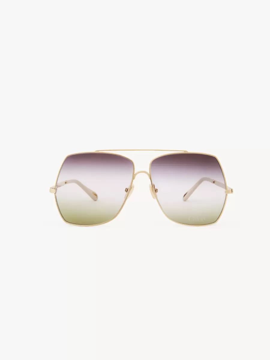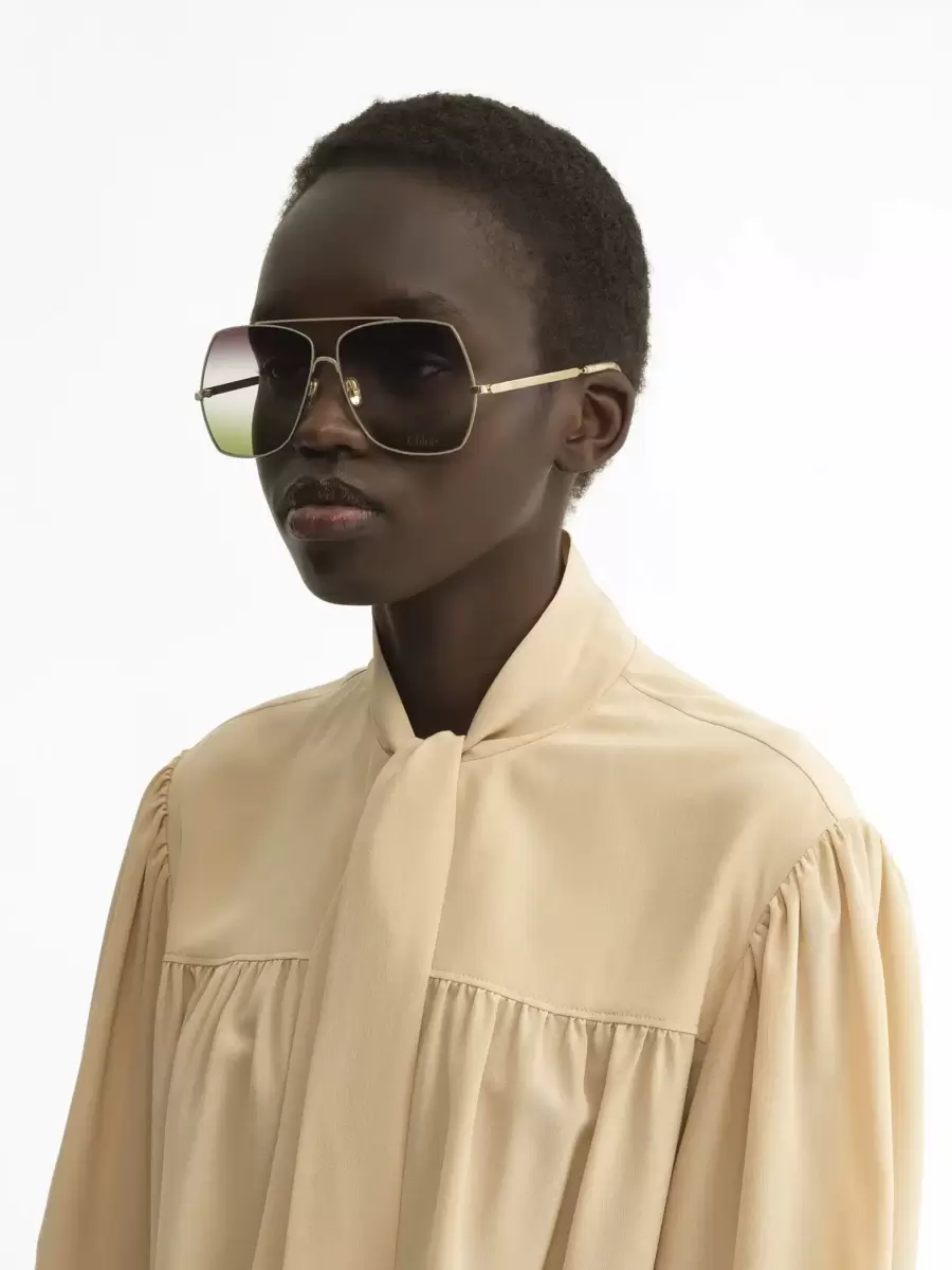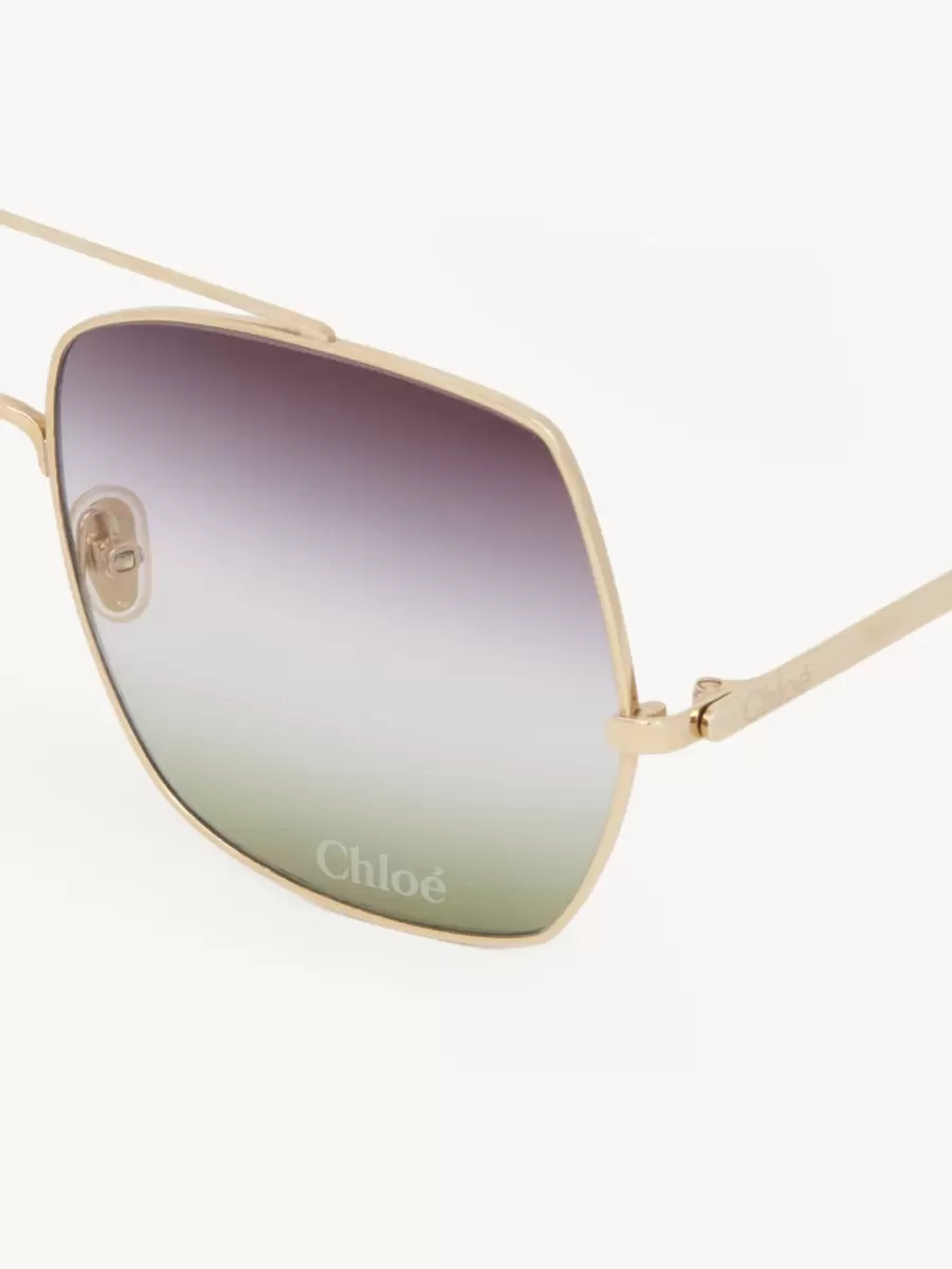 These Aly sunglasses offer a modern update on the classic aviator shape. Square frames in shiny gold-tone metal are set with triple gradient lenses in a palette of violet, crystal and green. The Chloé logo finishes the left lens.