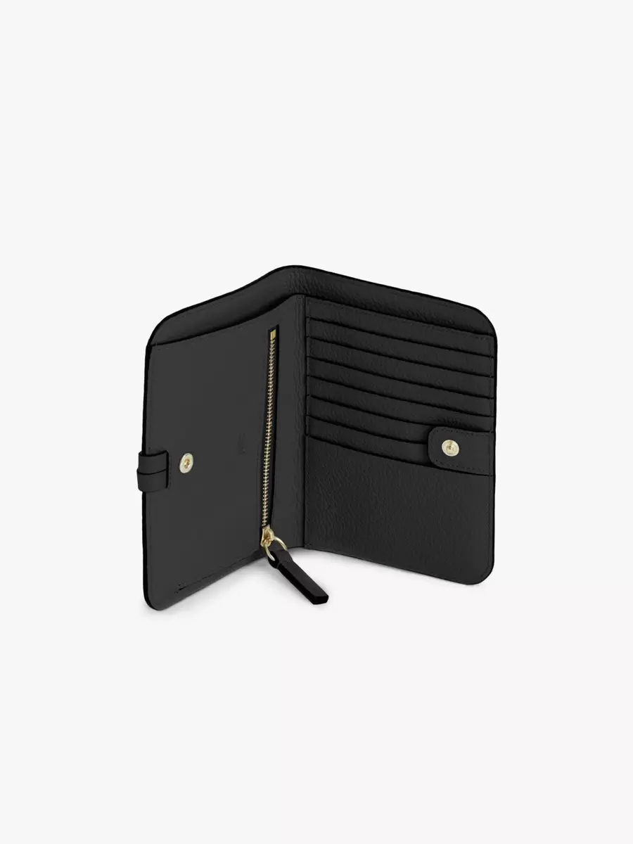 The Maison’s iconic Alphabet line includes this bifold wallet in grained and shiny calfskin, featuring a zipped compartment and multiple card slots.