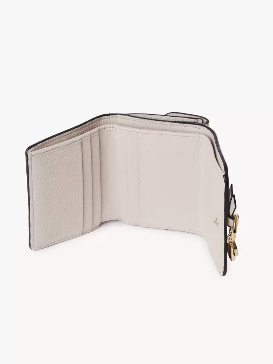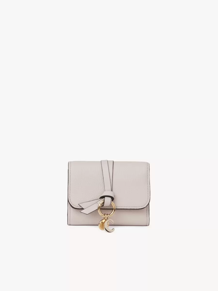 The Maison’s iconic Alphabet line includes this tri-fold wallet in grained and shiny calfskin. Designed to hold the essentials, it features multiple card slots and one flat pocket. The front is finished with a knotted link and Chloé-designed golden initial charms.