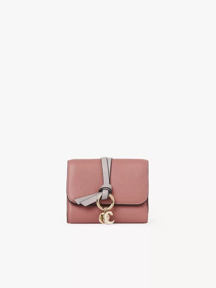 The Maison’s iconic Alphabet line includes this tri-fold wallet in grained and shiny calfskin. Designed to hold the essentials, it features multiple card slots and one flat pocket. The front is finished with a knotted link and Chloé-designed golden initial charms.