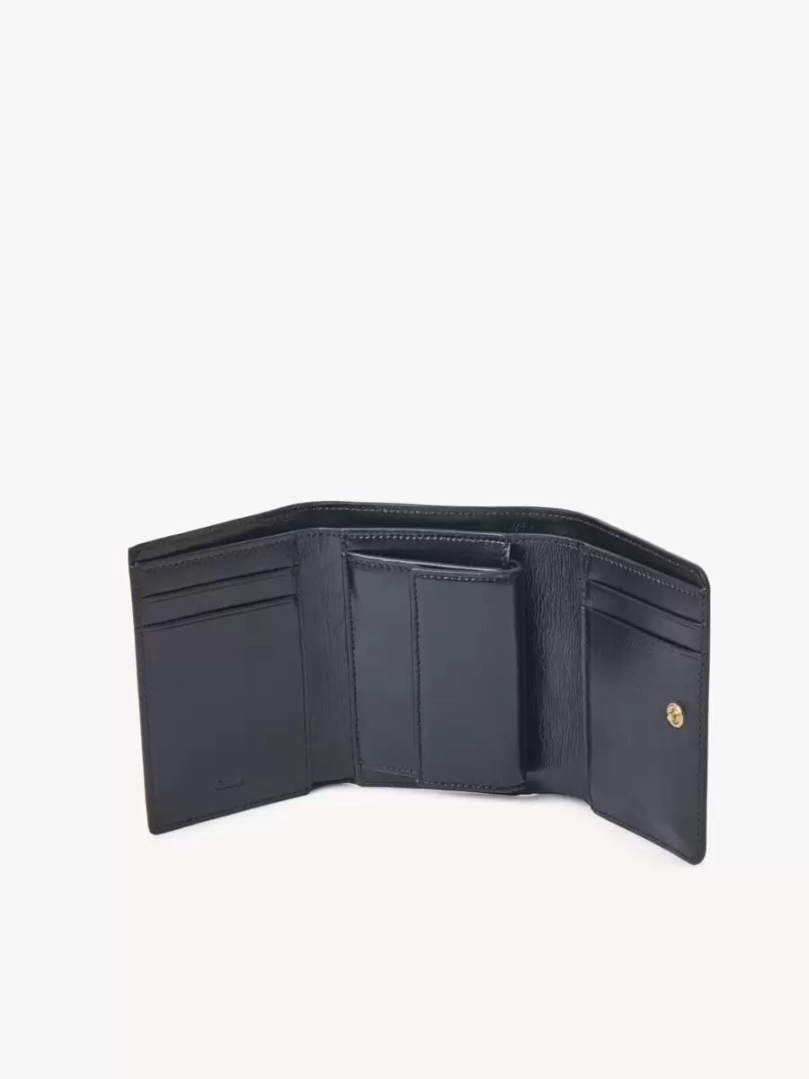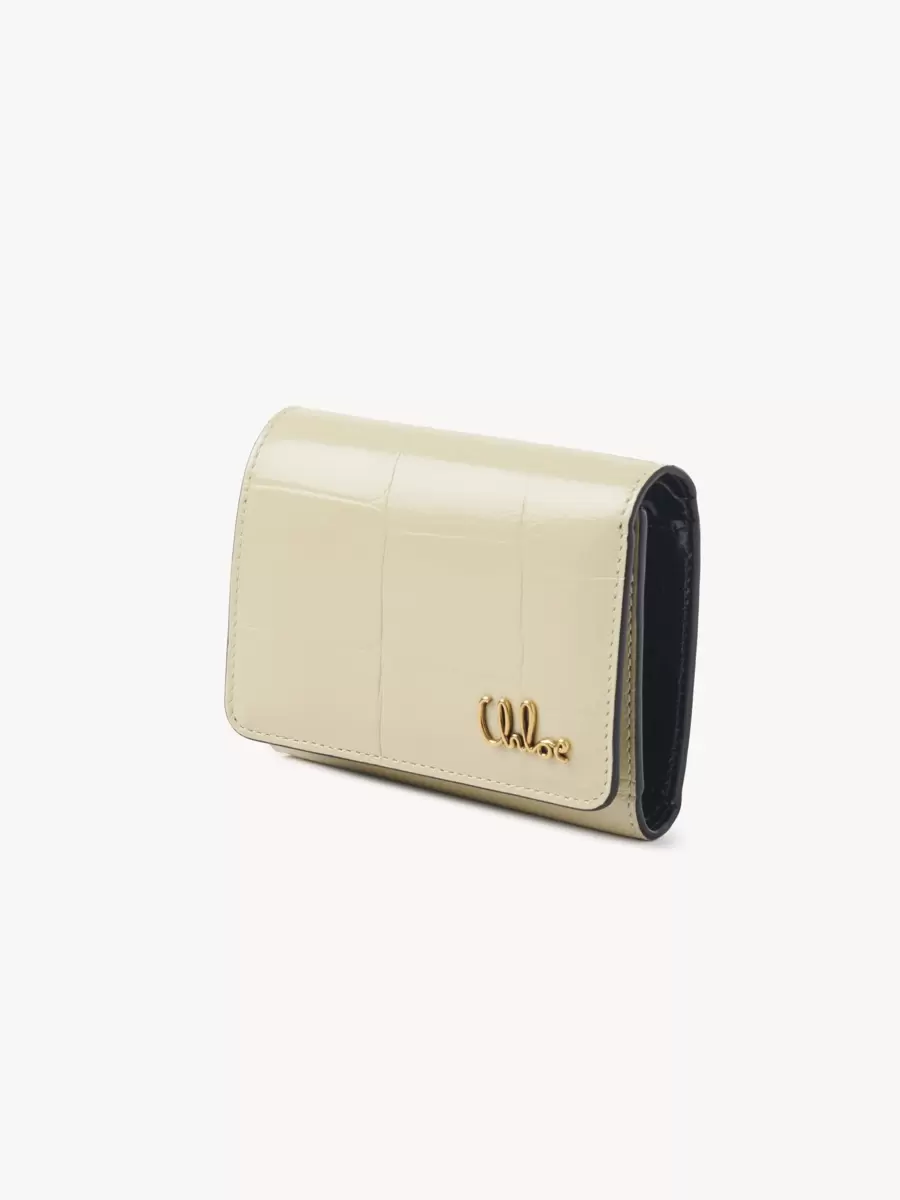 Crafted from croco-effect calfskin, this small Chloé Iconic tri-fold wallet combines a minimalist design with a metallic signature from the Maison’s archives.