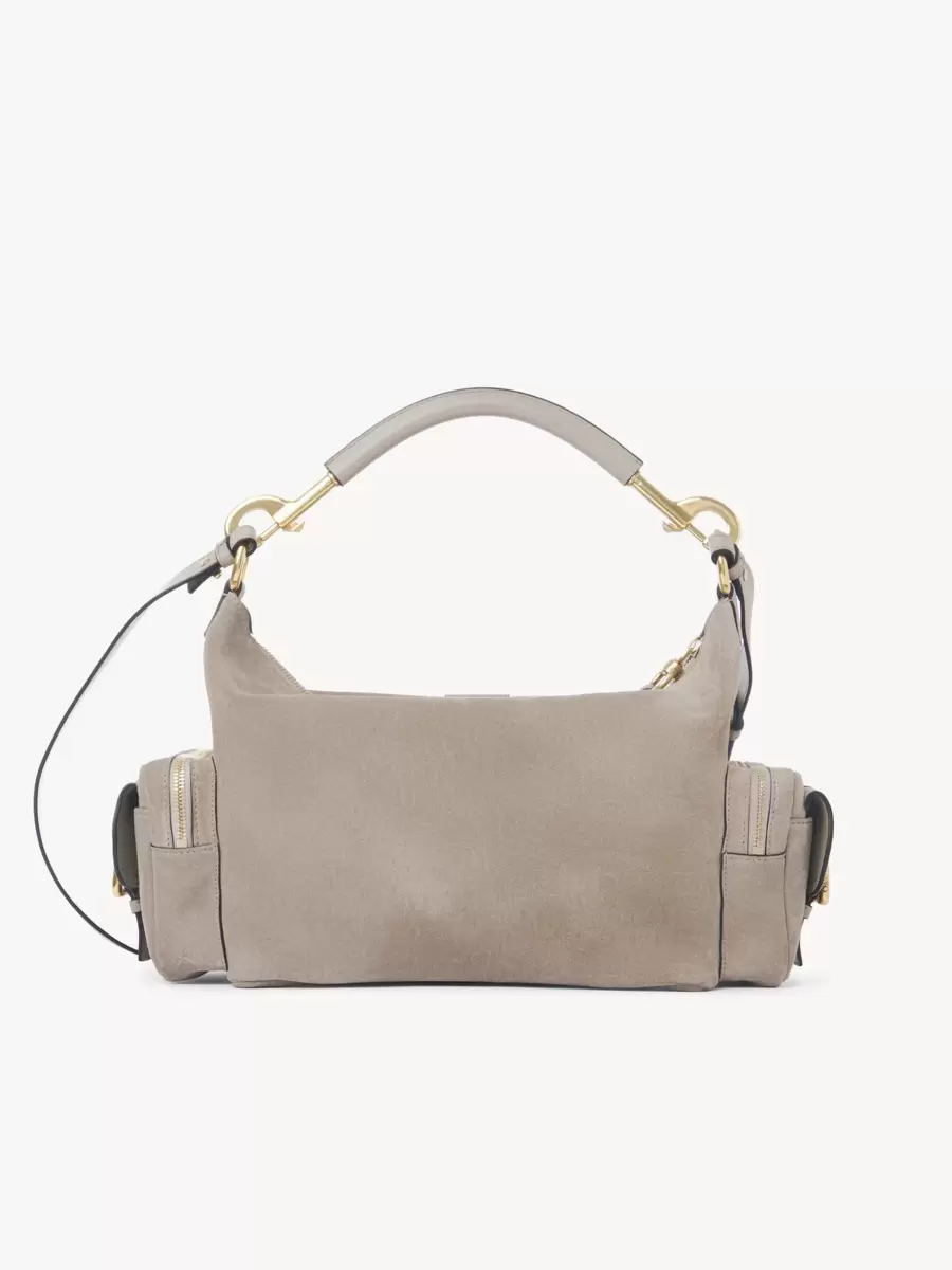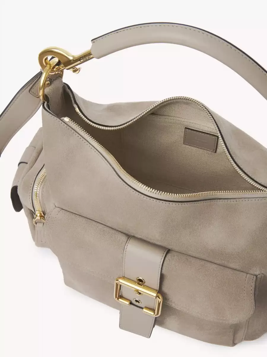 This Camera bag is crafted from suede calfskin. Its multiple pockets are embellished with revamped buckles from the iconic Paddington bag.