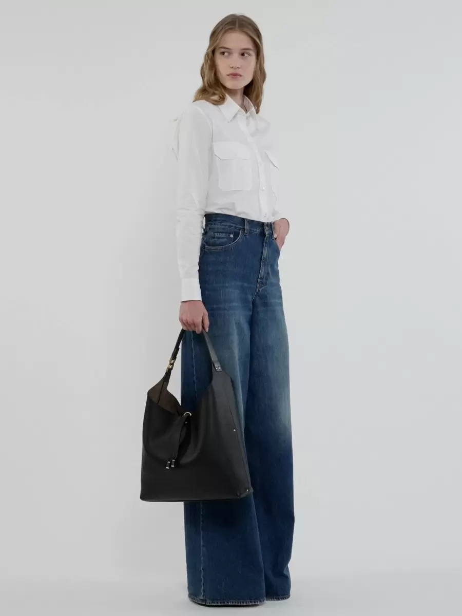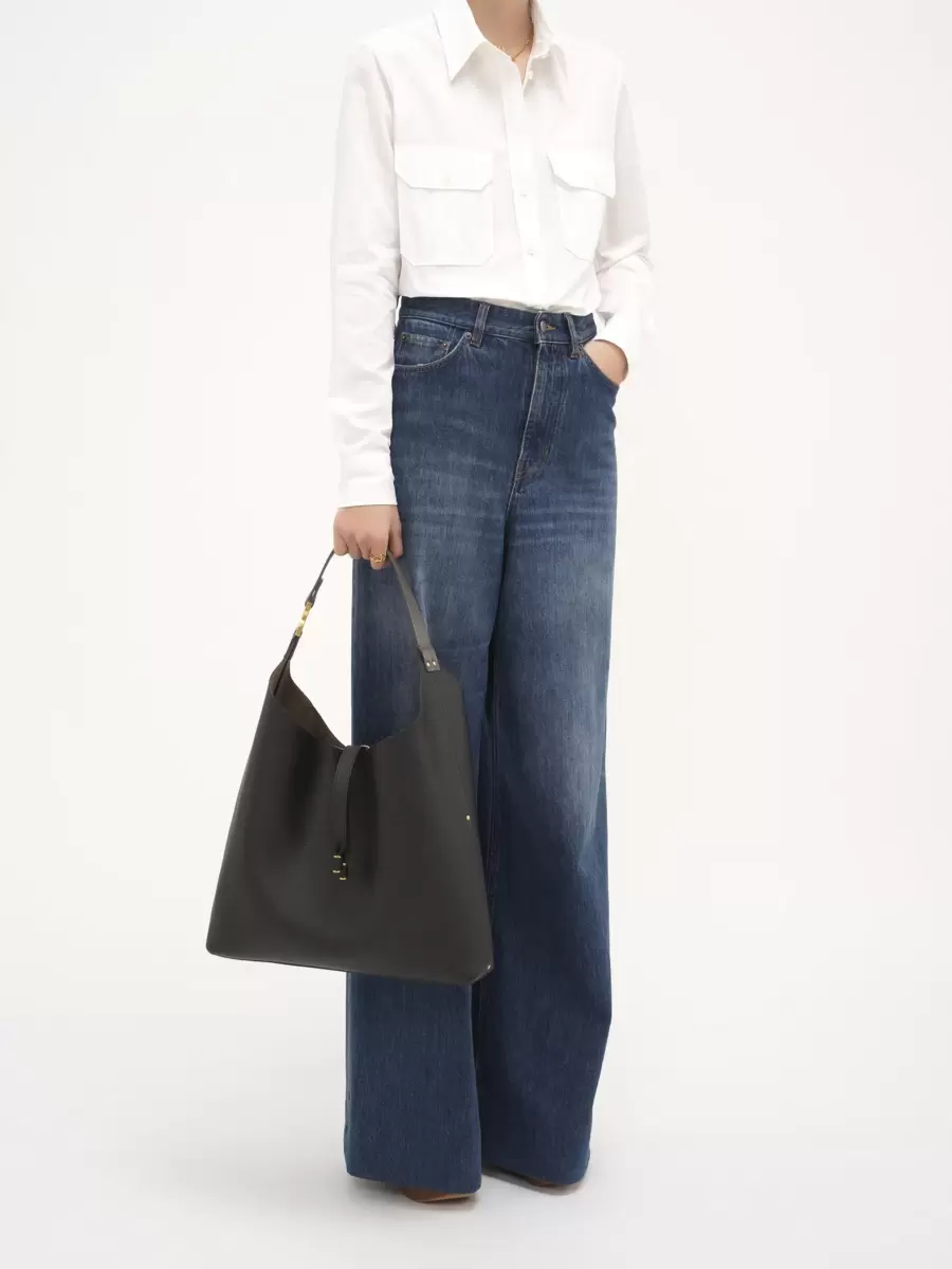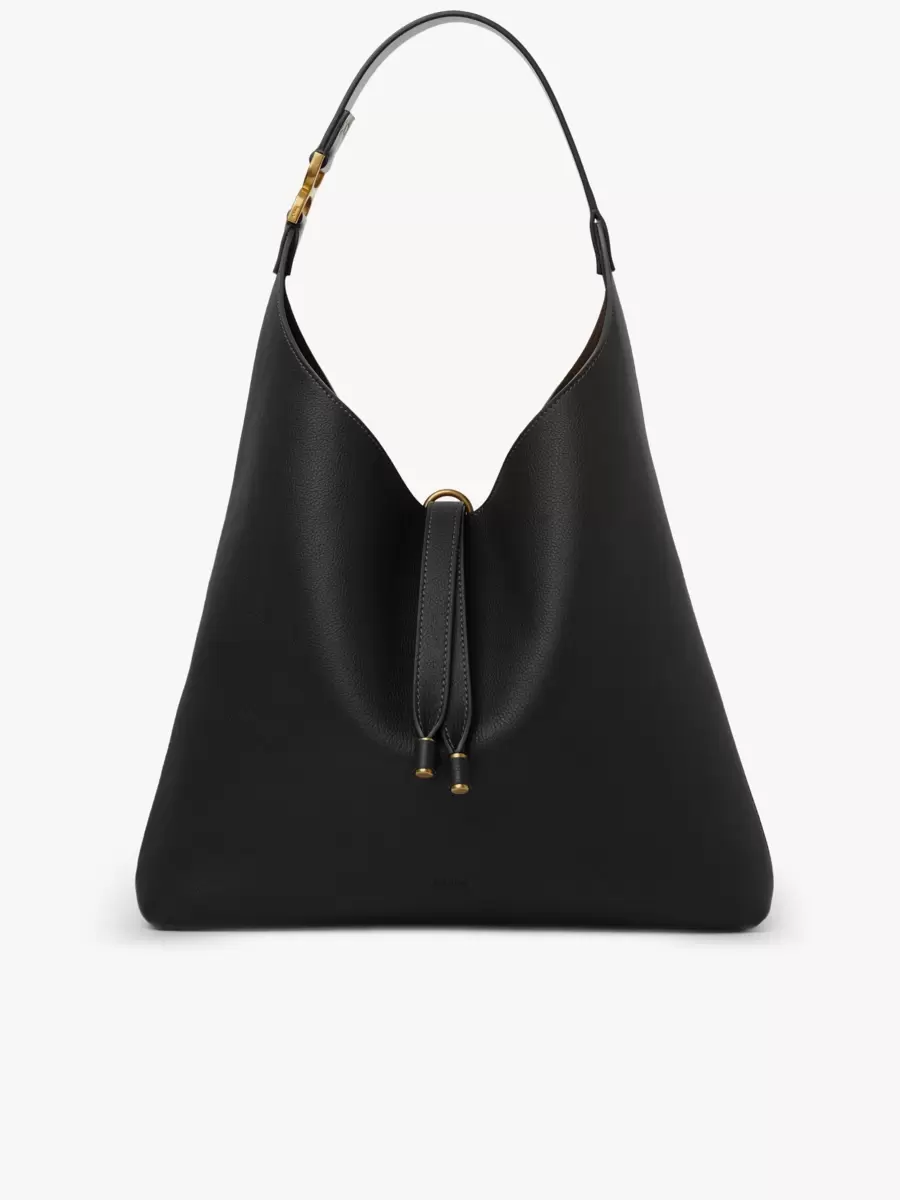 The Maison’s iconic Marcie line is expanded with this roomy hobo bag, matching clean lines with a soft and slouchy silhouette. Crafted from grained calfskin, the day bag features the line’s signature metallic piece on the leather handle.