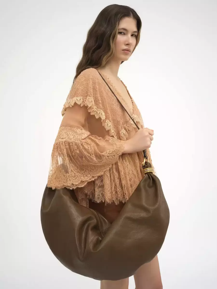 Inspired by the Maison’s Archives, this oversized Bracelet Hobo bag is crafted from shiny grained calfskin. The supple, rounded shape is elevated by stacked two-toned rings at the ends.