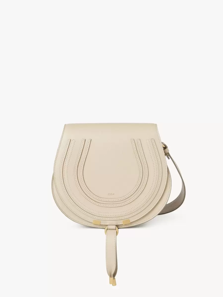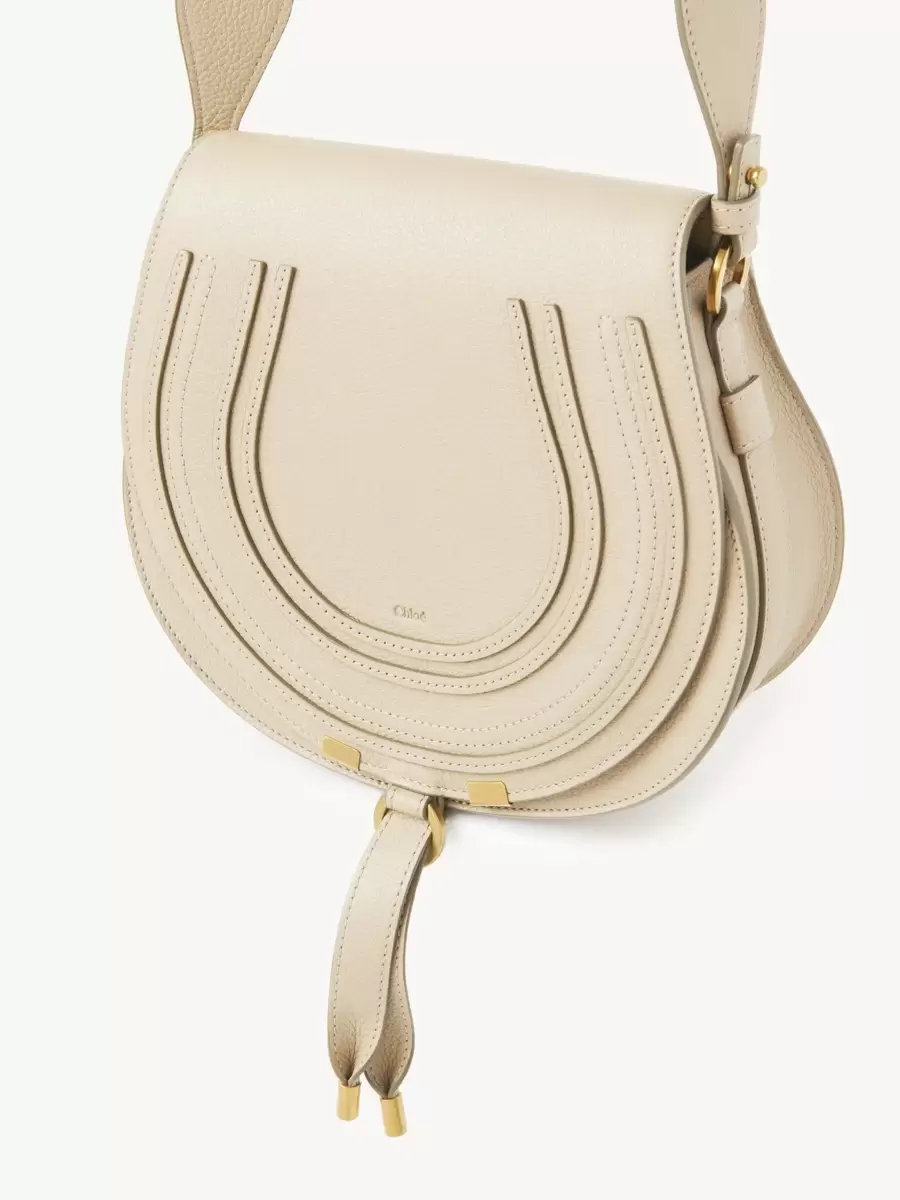 This Marcie saddle bag is crafted from grained calfskin with a rounded silhouette and a clean top line. The flap features the line’s iconic saddle stitching, secured with signature dangling leather tassels.