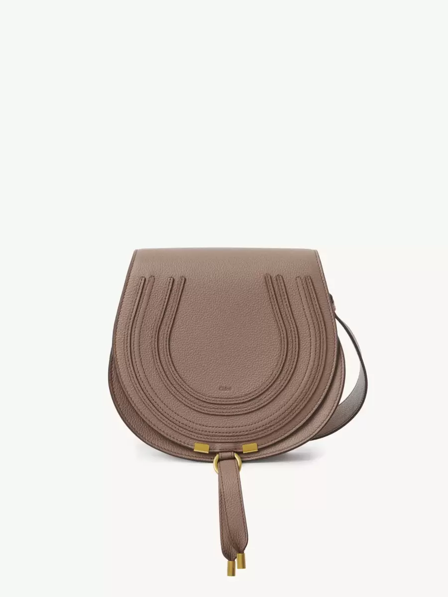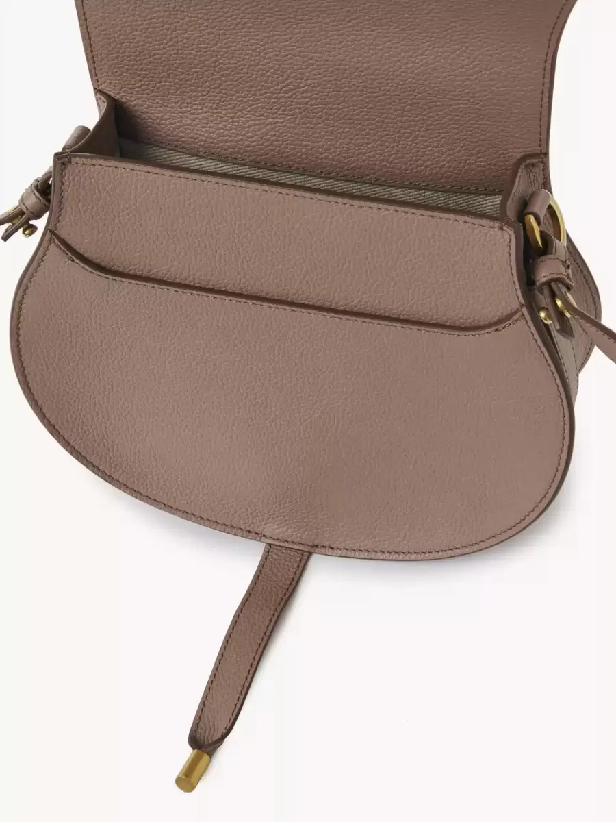 This Marcie saddle bag is crafted from grained calfskin with a rounded silhouette and a clean top line. The flap features the line’s iconic saddle stitching, secured with signature dangling leather tassels.