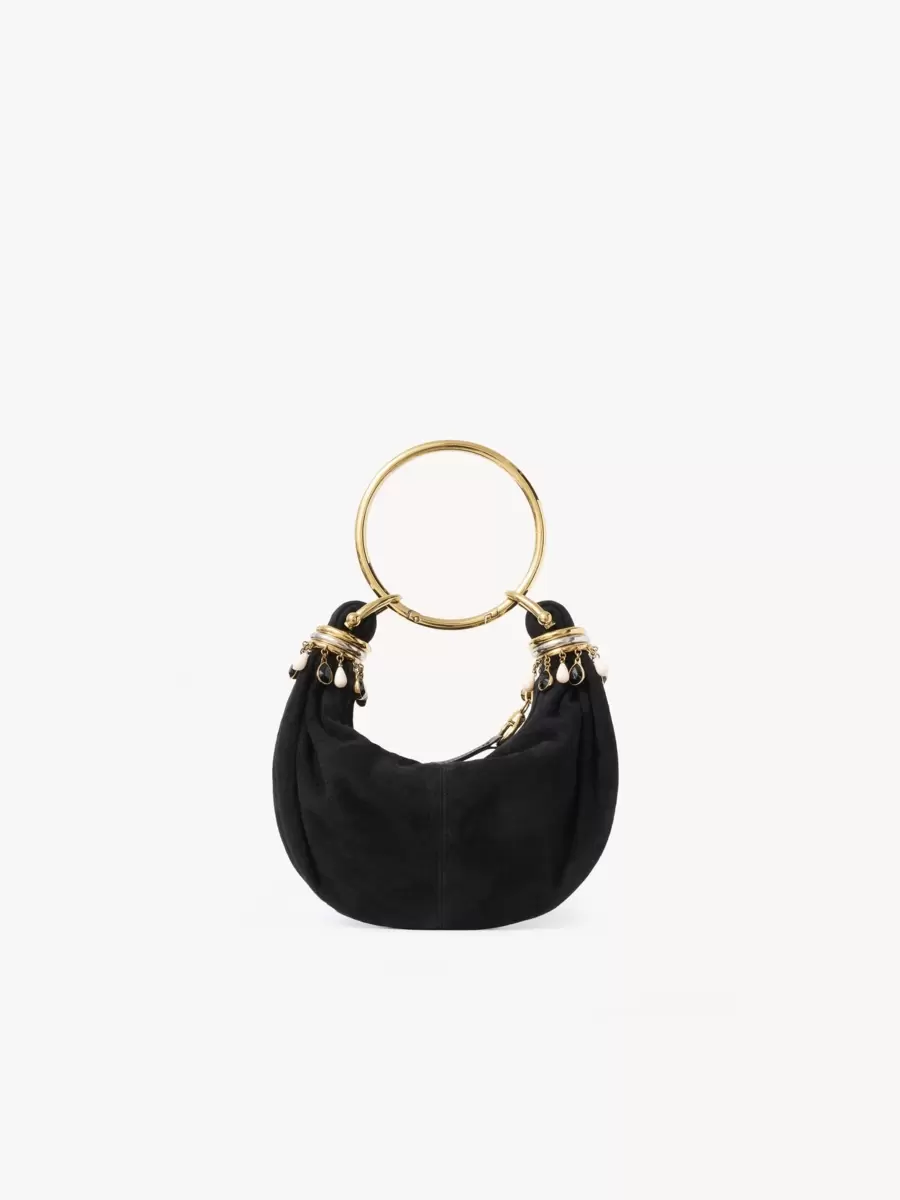 Inspired by the Maison’s Archives, this mini Bracelet Hobo bag is crafted from suede goatskin with a supple, rounded shape elevated by a bracelet handle. Stacked bi-color rings and dangling beads add jewelry embellishment.