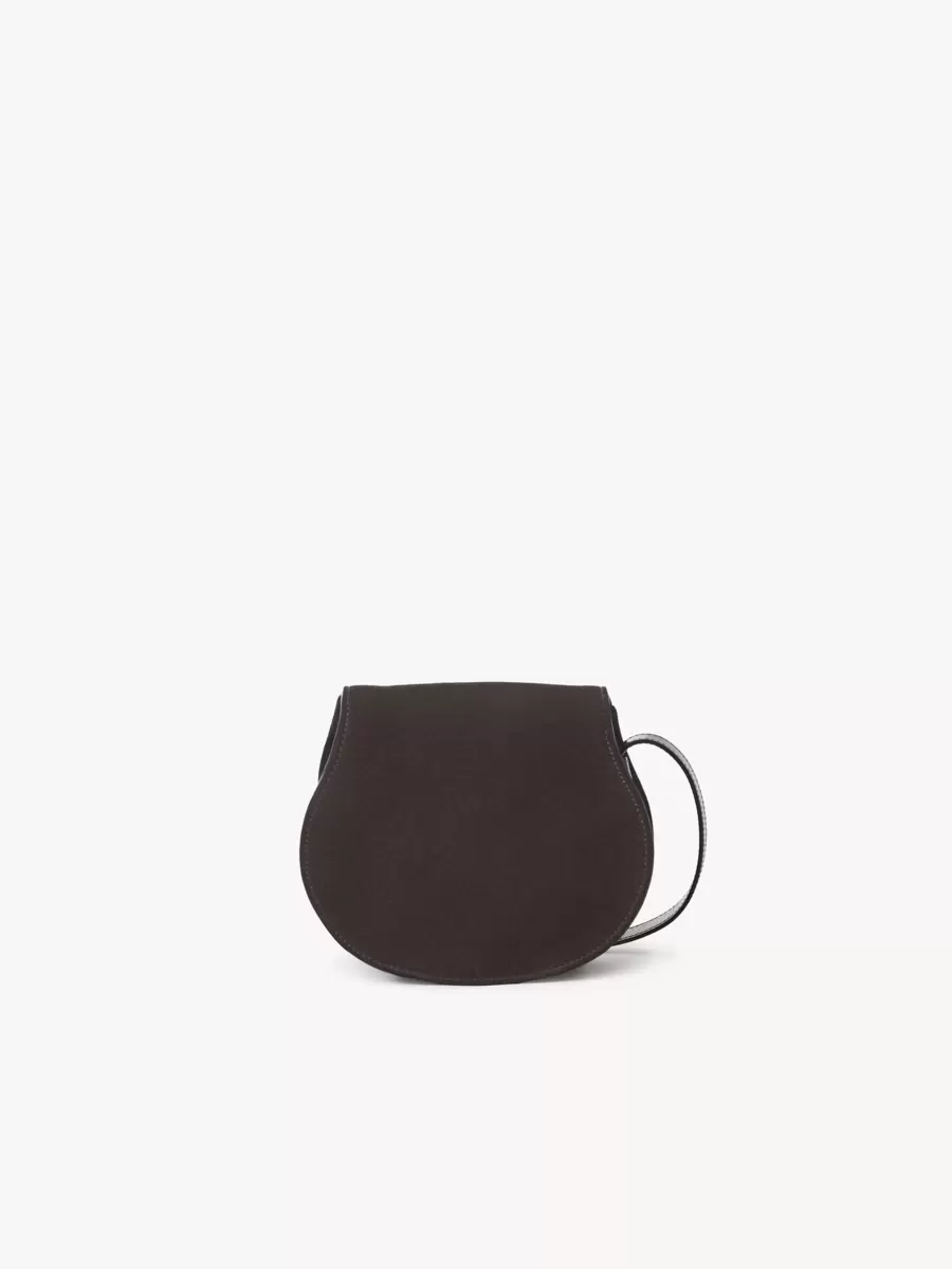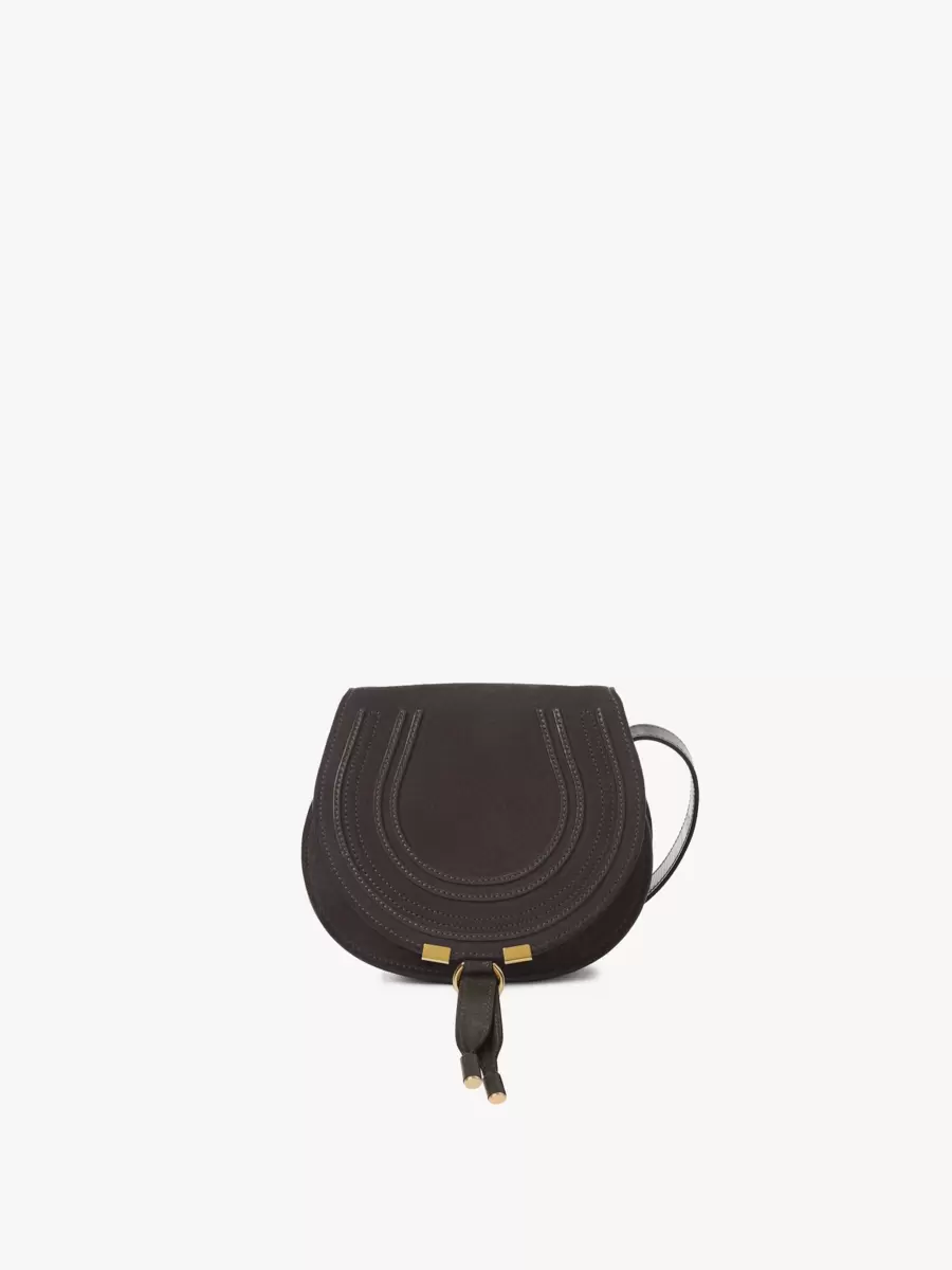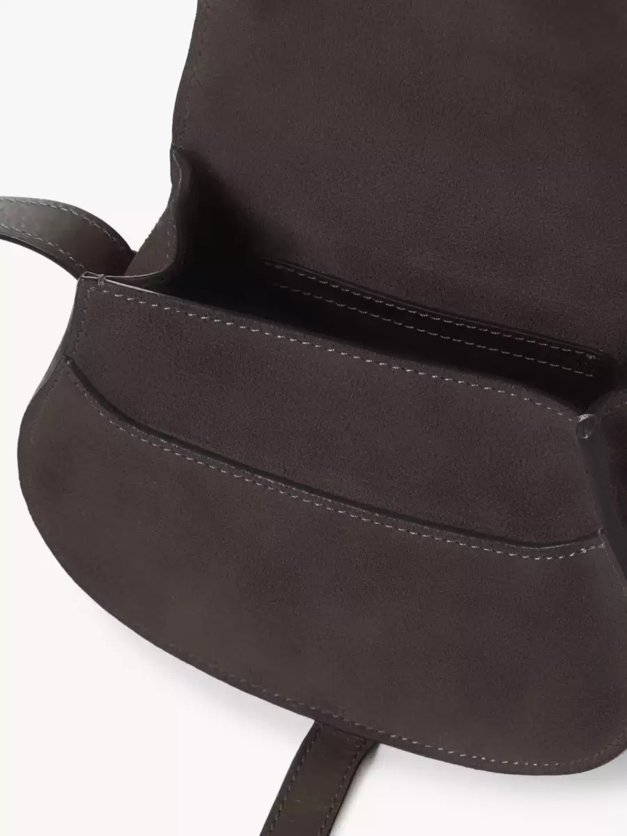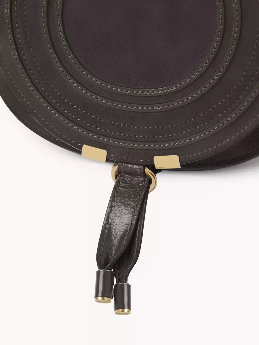This small Marcie saddle bag is crafted from suede calfskin with a rounded silhouette and a clean top line. The flap features the line’s iconic saddle stitching and is secured with signature dangling leather tassels.