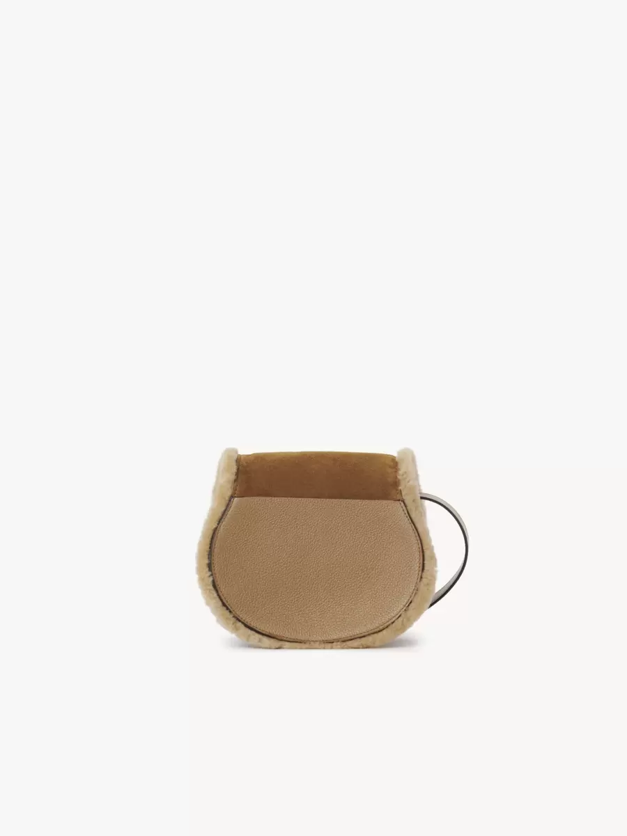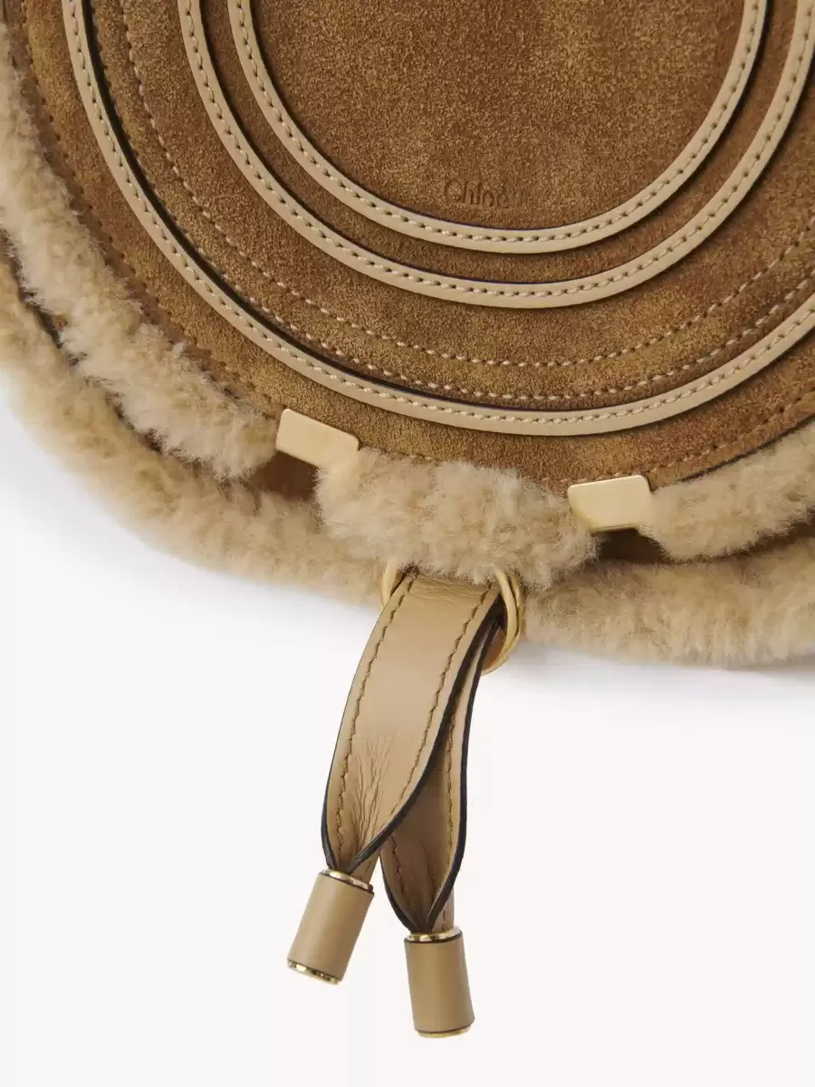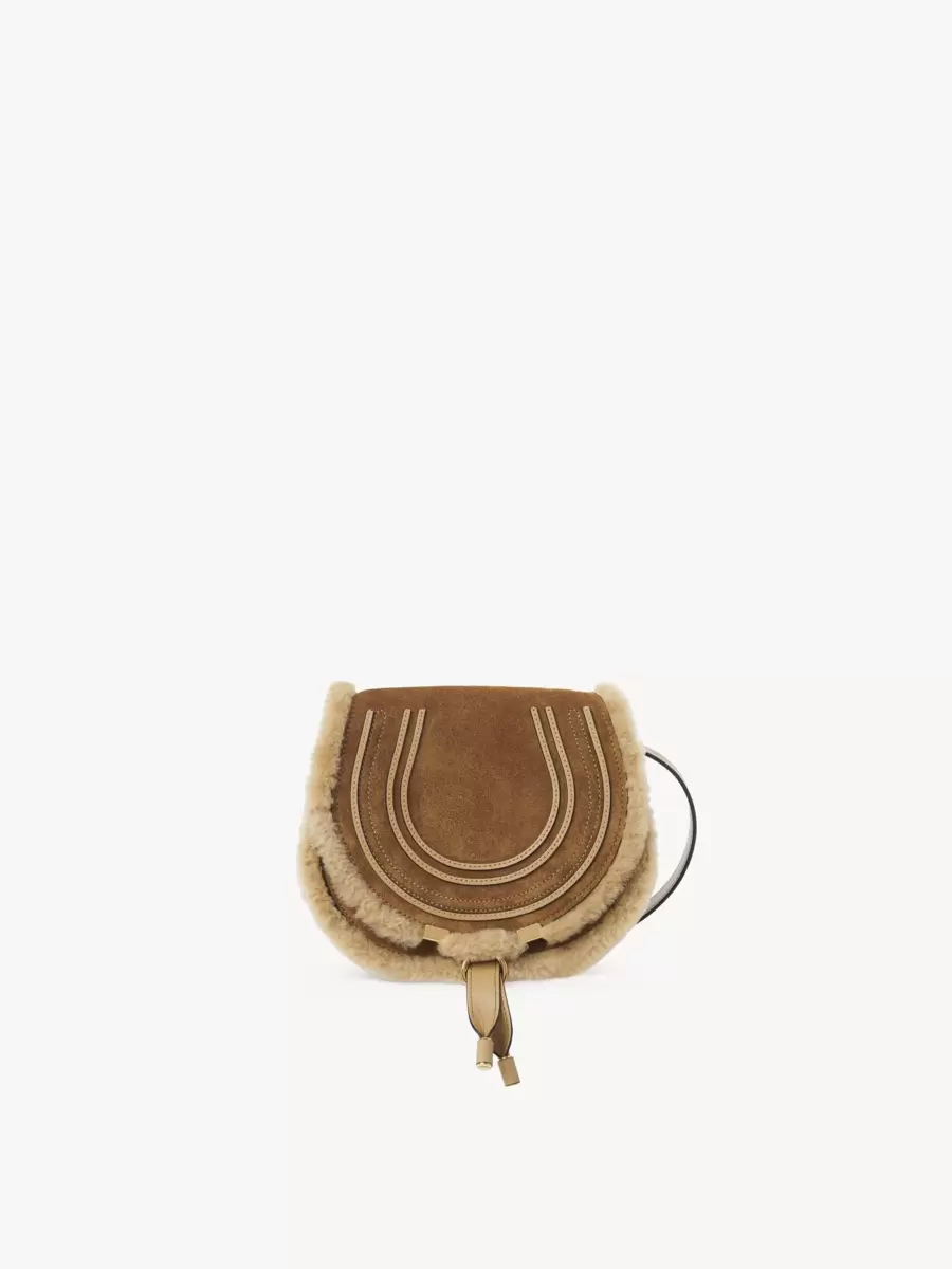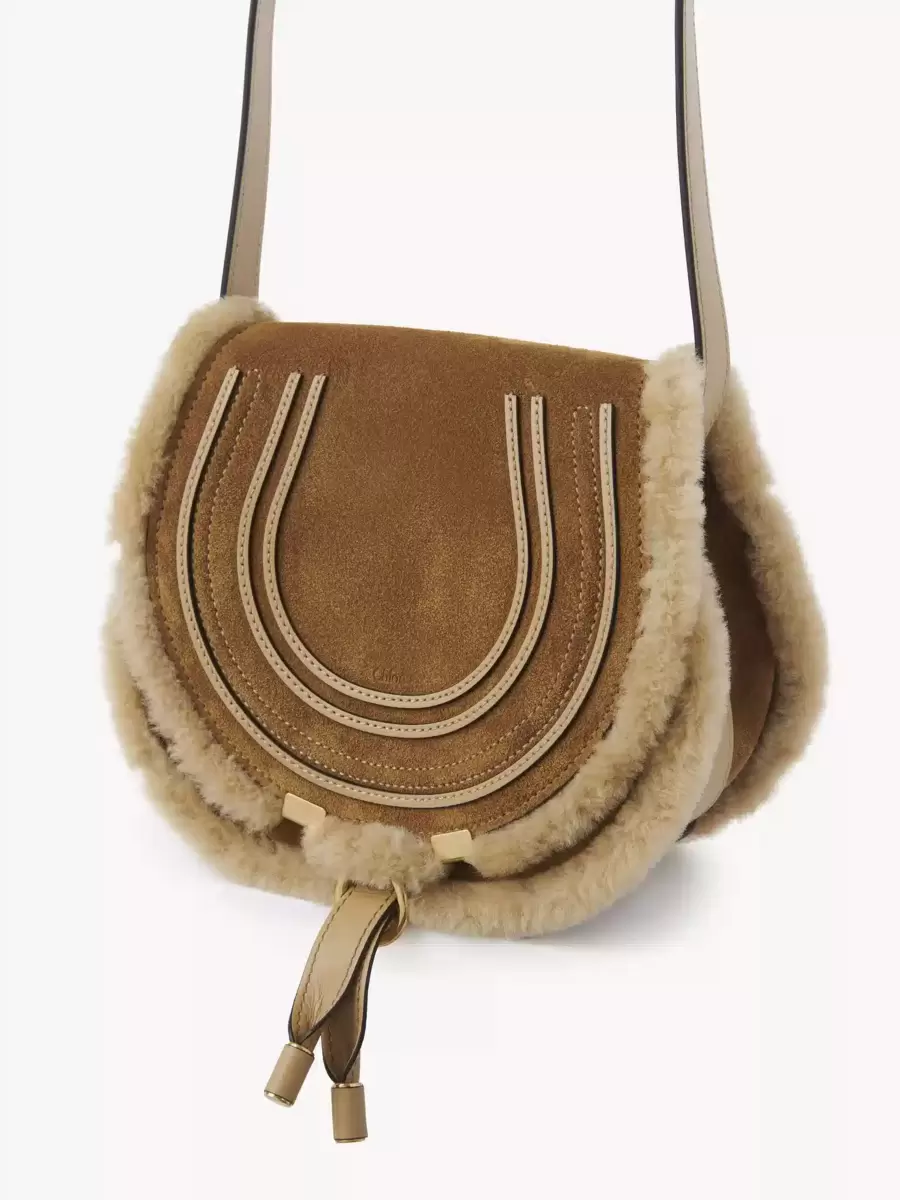 Crafted from suede calfskin with shearling trims, this small Marcie saddle bag pairs a rounded silhouette with a clean top line. The flap features the line’s iconic saddle stitching, secured with signature dangling leather tassels.