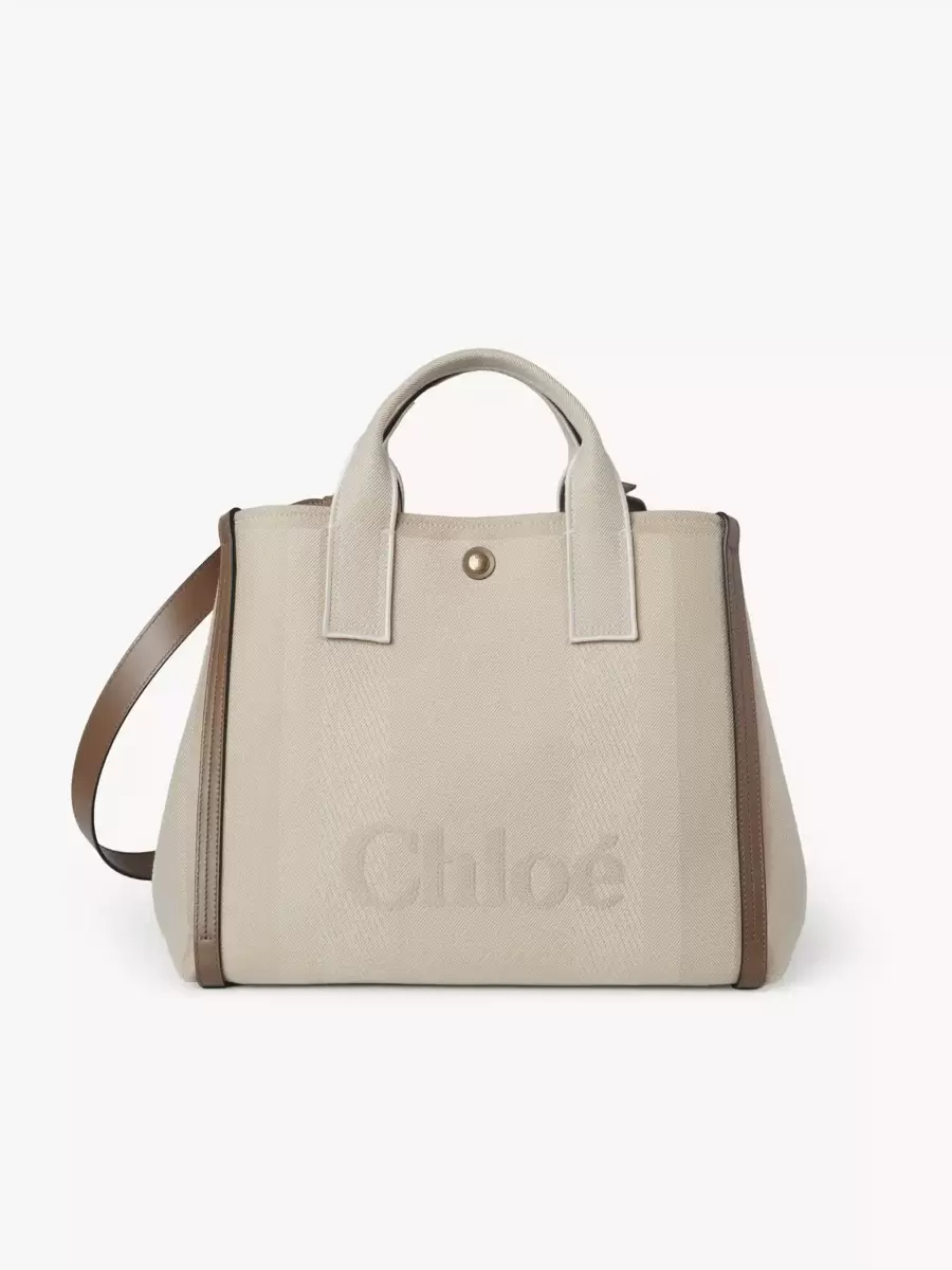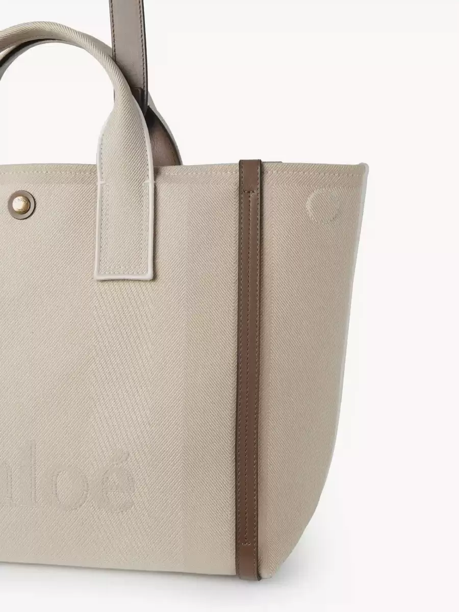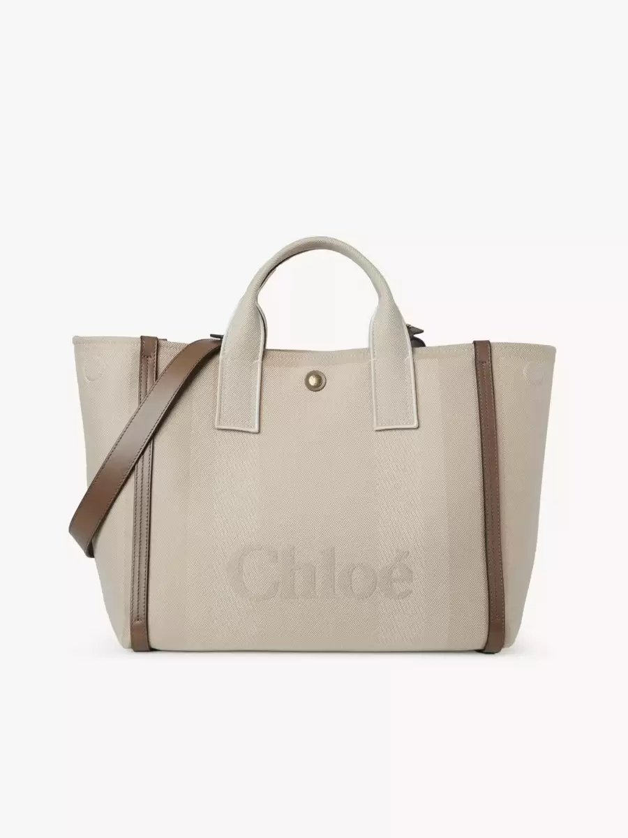 The Chloé Carry tote bag is crafted from striped cotton canvas jacquard, complemented by contrasting vertical leather bands and an oversized Chloé logo.