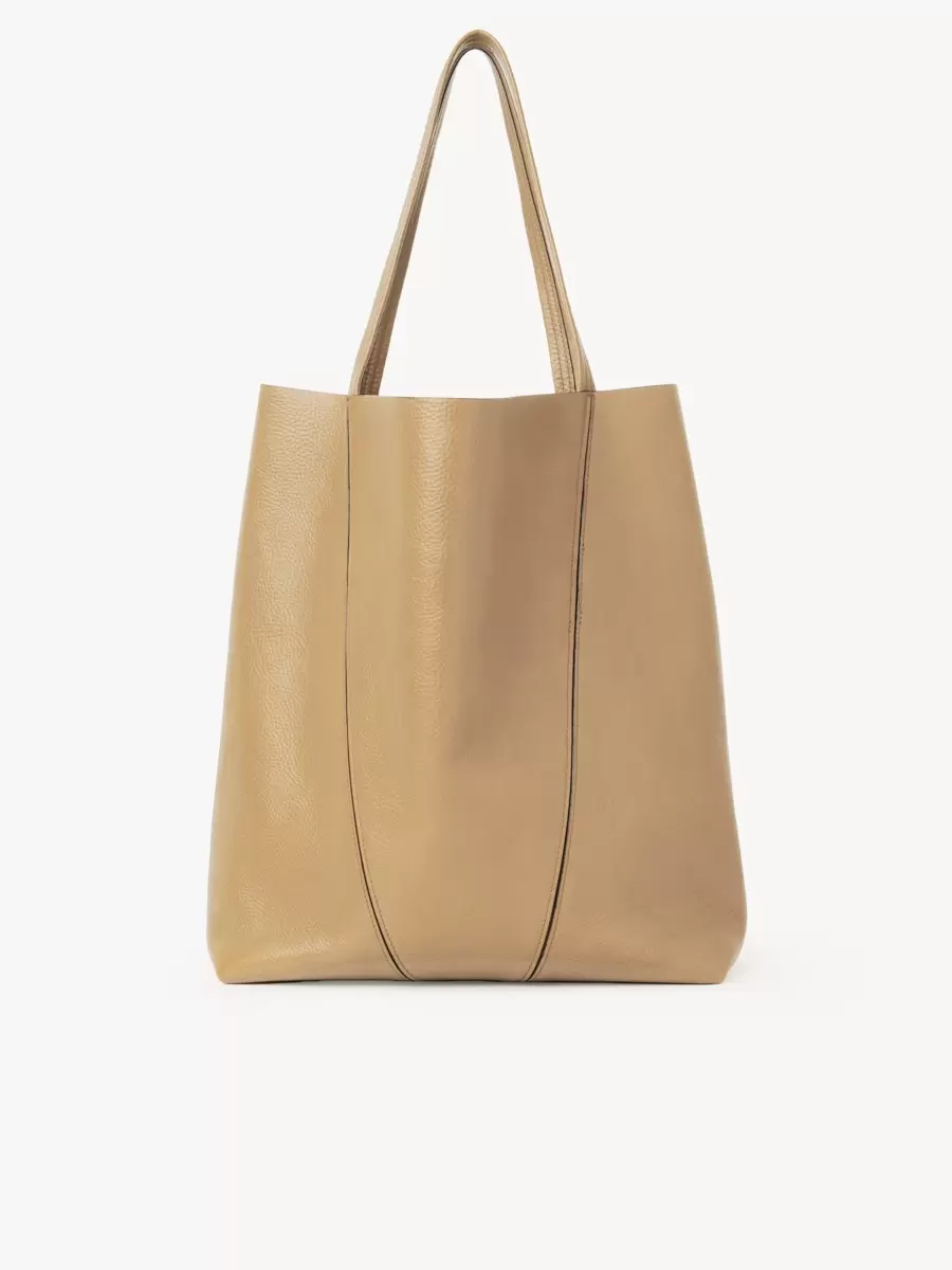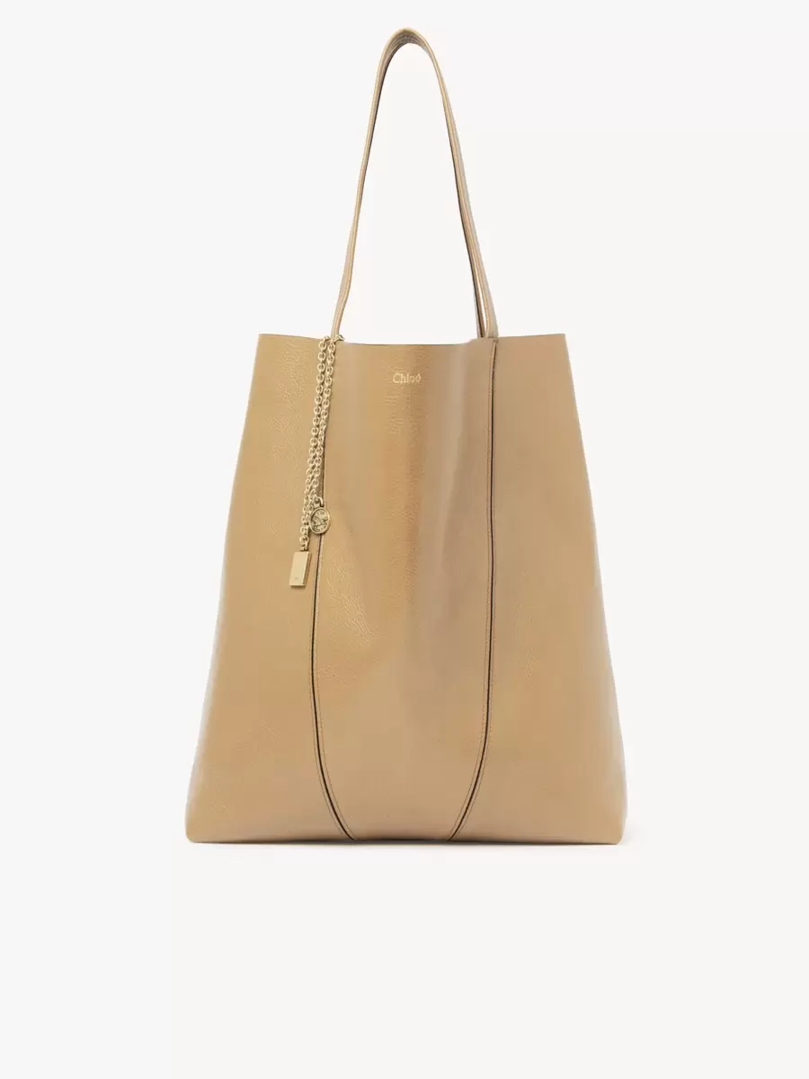 Crafted from shiny grained cowhide, the large Chloé Spin tote bag has a minimalist silhouette elevated with graphic lines. A dangling chain features the Maison’s signature Chloé and Horse Medals.