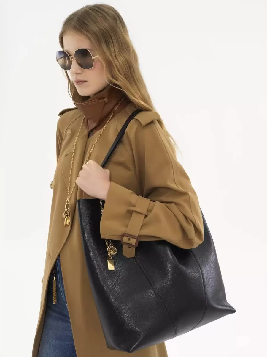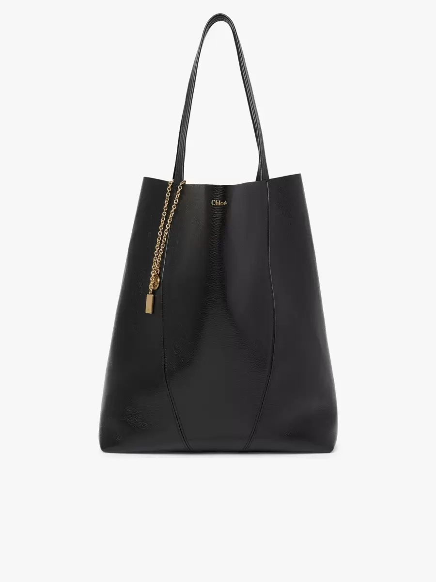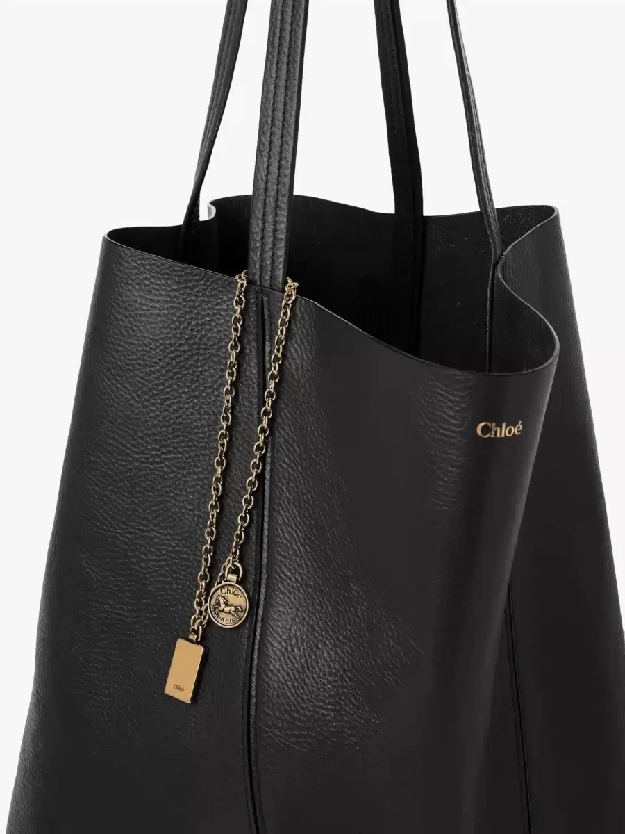 Crafted from shiny grained cowhide, the large Chloé Spin tote bag has a minimalist silhouette elevated with graphic lines. A dangling chain features the Maison’s signature Chloé and Horse Medals.