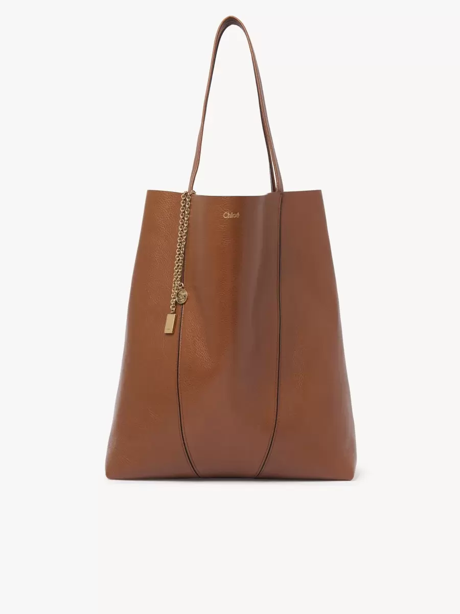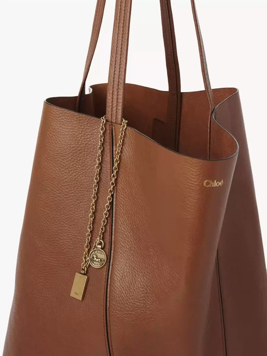 Crafted from shiny grained cowhide, the large Chloé Spin tote bag has a minimalist silhouette elevated with graphic lines. A dangling chain features the Maison’s signature Chloé and Horse Medals.