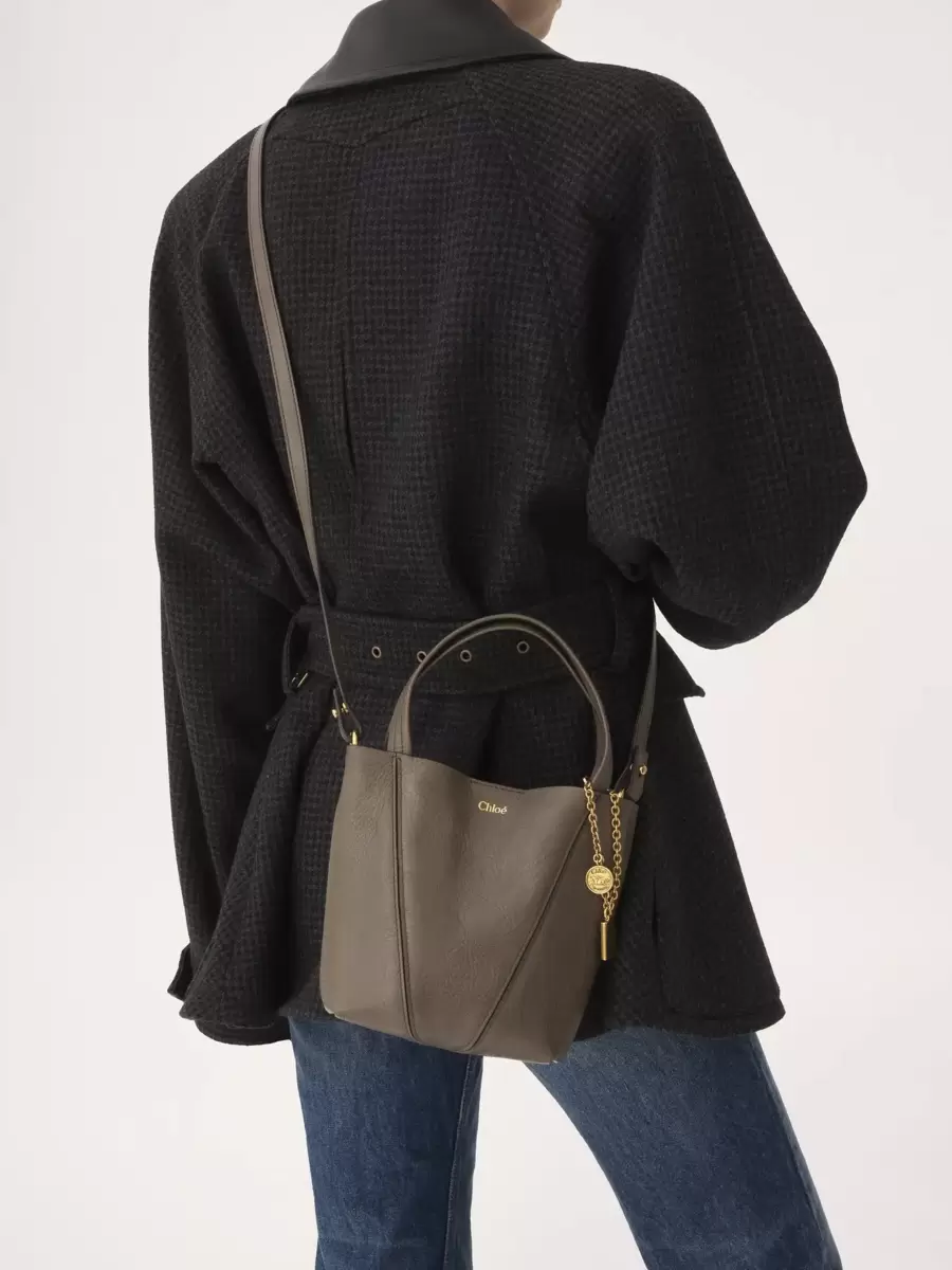 Crafted from shiny grained cowhide, the small Chloé Spin tote bag has a minimalist silhouette elevated with graphic lines. A dangling chain features the Maison’s signature Chloé and Horse Medals.