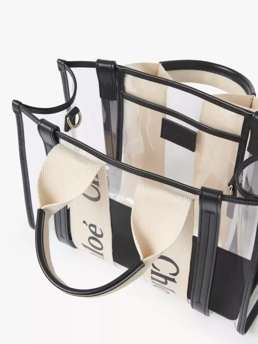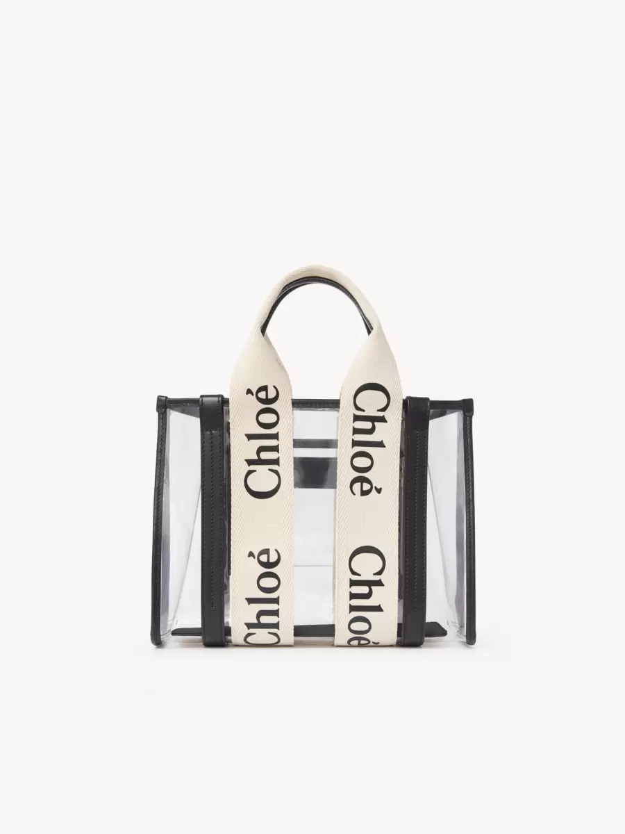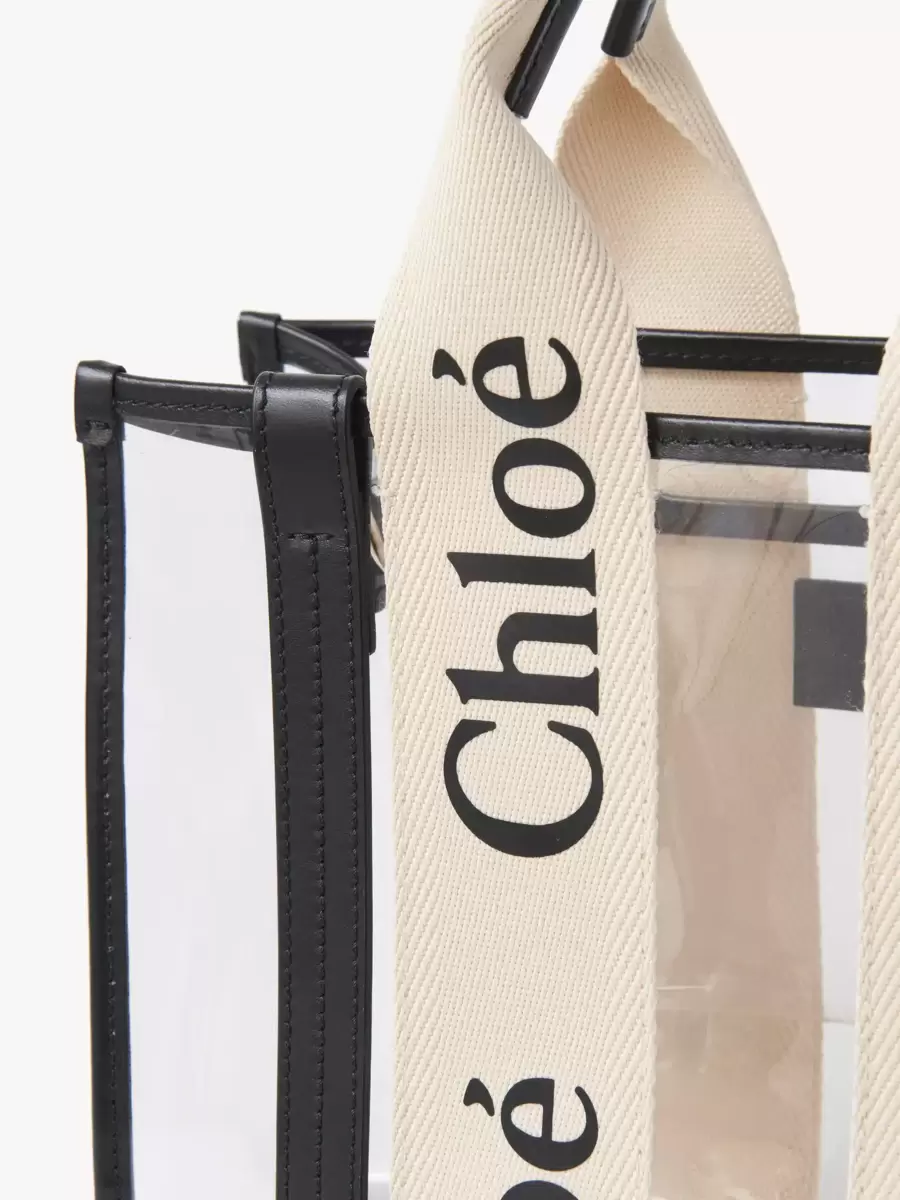 This small Woody jelly tote bag is elevated by contrasting vertical strips in calfskin and signature canvas ribbons featuring the Chloé logo.