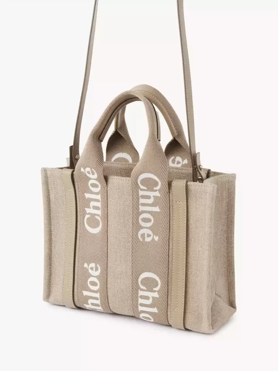 This small Woody tote bag is crafted from linen canvas, elevated by contrasting vertical strips in shiny calfskin and signature canvas ribbons embroidered with the Chloé logo.