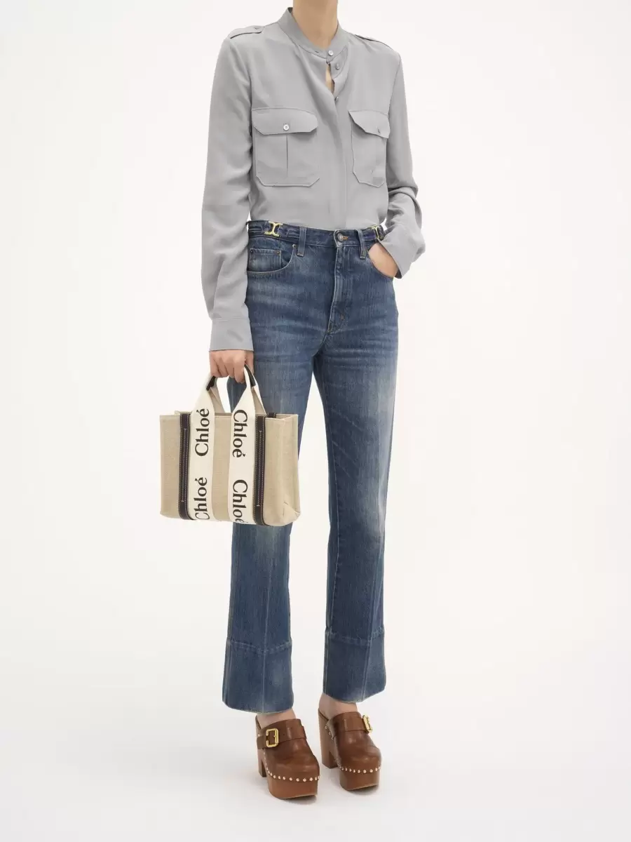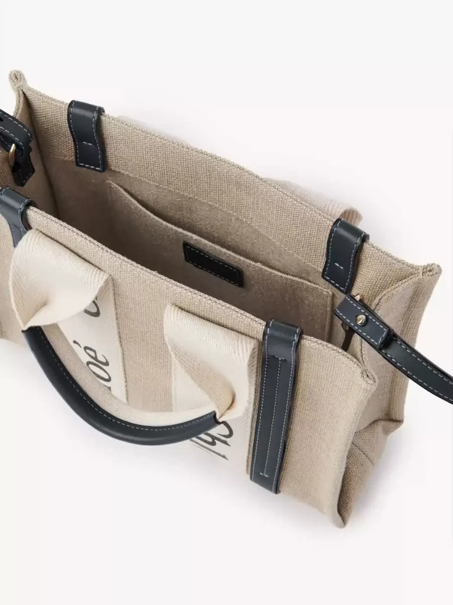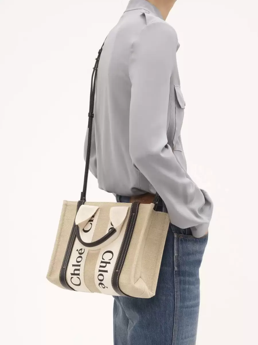 Crafted from lower-impact linen canvas detailed with shiny calfskin strips, this small Woody tote bag is a soft day bag with a removable long strap in addition to the top handles. The roomy inside compartment is unlined and includes a practical flat pocket in leather for an elevated touch. Carry this versatile small bag on the arm, shoulder or cross-body.